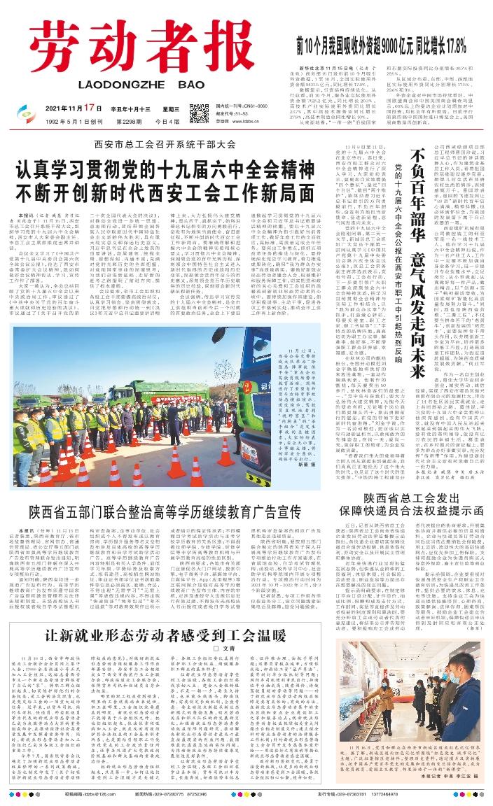 本报讯(记者 臧慧 实习记者 刘张念子)11月15日,西安市总工会召开系统干部大会,组织学习党的十九届六中全会精神,西安市人大常委会副主任、市总工会主席薛振虎出席并讲话。 会议全文学习了《中国共产党第十九届中央委员会第六次全体会议公报》,传达了西安市委常委扩大会议精神,就如何做好会议精神传达、学习、宣传工作作了部署。 大家一致认为,全会总结回顾了党的十九届五中全会以来中央政治局工作,审议通过了《中共中央关于党的百年奋斗重大成就和历史经验的决议》,审议通过了《关于召开党的第二十次全国代表大会的决议》,对推动全党进一步统一思想、意志和行动,团结带领全国各族人民夺取新时代中国特色社会主义新的伟大胜利,具有重大现实意义和深远历史意义。习近平总书记在全会上发表的重要讲话,高屋建瓴、统揽全局、思想深刻、内涵丰富,充满对党的光辉历史的全面把握、对党和国家事业的深邃思考,为我们奋进新征程、走好新的赶考之路指明了前进方向、提供了根本遵循。 会议要求,全市工会组织和各级工会干部要提高政治站位,认真学习领会、坚决贯彻落实,自觉把思想和行动统一到《决议》和习近平总书记重要讲话精神上来,大力弘扬伟大建党精神,埋头苦干、真抓实干,始终沿着总书记指引的方向勇毅前行,奋发有为地担当新使命、奋进新征程,不断开创新时代西安工会工作新局面。要准确理解和把握六中全会的精神实质和核心要义,学习贯彻六中全会精神,深刻领会党的百年光辉历程、深刻领会中国特色社会主义进入新时代取得的历史成绩和历史变革,深刻领会党百年奋斗的历史意义,深刻领会党百年历史取得的历史经验,深刻领会新时代新征程新任务。 会议强调,传达学习宣传党的十九届六中全会精神,是全市工会组织当前和今后一个时期的首要政治任务,全会上下要迅速掀起学习贯彻党的十九届六中全会和习近平总书记重要讲话精神的热潮。要以十九届六中全会精神为指引做好当前各项工作,做好年度工作的全面收官,高标准、高质量完成全年任务。要突出工作重点,抓好五项改革任务的推进与深化。要持续深化党史学习教育,着力推进成果转化,确保“我为群众办实事”高质量落实。要做好新就业形态劳动者建会入会、权益维护和服务保障工作,切实把党和政府的关心关爱和工会组织的温暖送到新就业形态劳动者的心坎中。要持续加强作风建设,倡导积极谋事、主动干事,促进各项工作落到实处,推动全市工会工作再上新台阶。