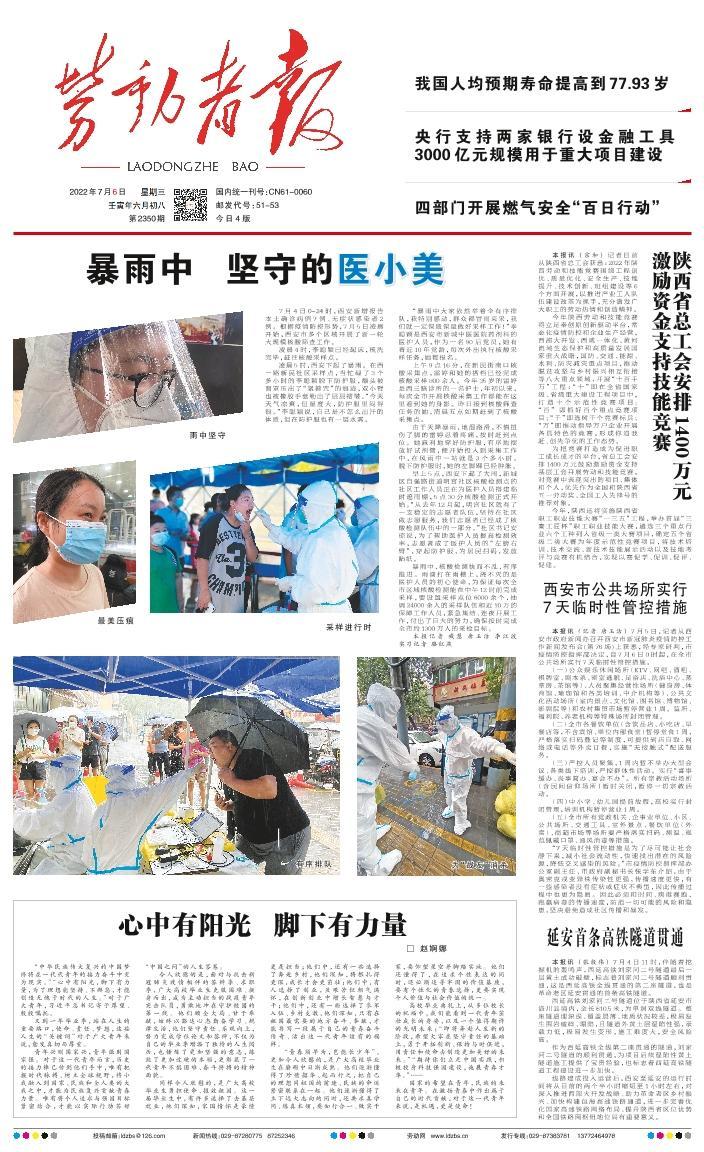 雨中坚守 最美压痕 采样进行时 有序排队 为“战友”消杀 7月4日0-24时,西安新增报告本土确诊病例 7例、无症状感染者 2例。根据疫情防控形势,7月5日凌晨开始,西安市多个区域开展了新一轮大规模核酸筛查工作。 凌晨4时,李聪颖已经起床,梳洗完毕,赶往核酸采样点。 凌晨5时,西安下起了暴雨。在西一路新民社区采样点,当忙碌了3个多小时的李聪颖脱下防护服,额头被面罩压出了“紧箍咒”的痕迹,双小臂也被橡胶手套勒出了层层褶皱。“今天天气凉爽,但湿度大,防护服里闷得很。”李聪颖说,自己是不怎么出汗的体质,但在防护服也有一层水雾。 “暴雨中大家依然举着伞有序排队,我特别感动,群众都冒雨来采,我们就一定保质保量做好采样工作!”李聪颖是西安市新城中医医院药剂科的医护人员,作为一名90后党员,她有着近10年党龄,每次外出执行核酸采样任务,她都报名。 上午9点16分,在新民街南口核酸采集点,雷苹和她的搭档已经完成核酸采样800余人。今年35岁的雷苹是西三路诊所的一名护士,年初以来,每次全市开展核酸采集工作都能在这里看到她的身影。昨日接到核酸筛查任务的她,清晨五点如期赶到了核酸采集点。 由于天降暴雨,地湿路滑,不慎扭伤了脚的雷苹忍着疼痛,按时赶到点位。她麻利地穿好防护服,有序地摆放好试剂管,便开始投入到采集工作中,在风雨中一站就是3个多小时。脱下防护服时,她的左脚踝已经肿胀。 早上5点,西安下起了大雨,新城区自强路街道明宫社区核酸检测点的社区工作人员正在为医护人员搭建临时遮雨棚,5点30分核酸检测正式开始。“从去年12月起,明宫社区就有了一支稳定的志愿者队伍,坚持在社区做志愿服务,我们志愿者已经成了核酸检测队伍中的一部分。”社区书记安琼说,为了帮助医护人员提高检测效率,志愿者成了医护人员的“左膀右臂”,穿起防护服,为居民扫码,发放贴纸。 暴雨中,核酸检测快而不乱,有序推进。雨滴打在雨棚上,浇不灭的是医护人员的初心使命,为保证每次全市区域核酸检测能在中午12时前完成采样,要设置采样点位6000余个,抽调24000余人的采样队伍和近10万的保障工作人员,紧急集结、连夜开展工作,付出了巨大的努力,确保按时完成全市约1300万人的采检目标。 本报记者 臧慧 唐玉洁 李江波实习记者 骆红燕