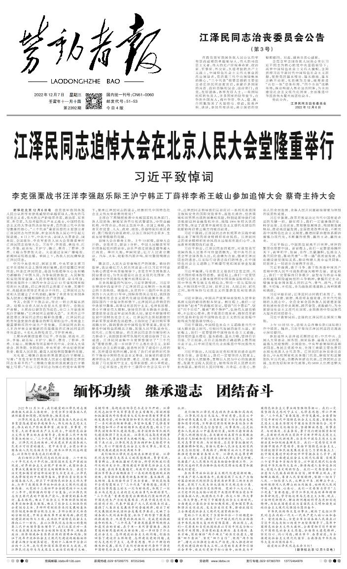 2022年11月30日,我们敬爱的江泽民同志因病抢救无效在上海逝世。全党全军全国各族人民满怀敬意和深情,深切悼念,极其悲痛。 江泽民同志是我党我军我国各族人民公认的享有崇高威望的卓越领导人,伟大的马克思主义者,伟大的无产阶级革命家、政治家、军事家、外交家,久经考验的共产主义战士,中国特色社会主义伟大事业的杰出领导者,党的第三代中央领导集体的核心,“三个代表”重要思想的主要创立者。江泽民同志的逝世,对我党我军我国各族人民是不可估量的损失。党中央号召,全党全军全国各族人民化悲痛为力量,继承江泽民同志的遗志,以实际行动表达我们的悼念。 我们缅怀江泽民同志的光辉业绩。二十世纪八十年代末九十年代初,国际国内发生严重政治风波,世界社会主义出现严重曲折,我国社会主义事业发展面临空前巨大的困难和压力。在这个决定党和国家前途命运的重大历史关头,江泽民同志带领党的中央领导集体,紧紧依靠全党全军全国各族人民,捍卫了中国特色社会主义伟大事业,打开了我国改革开放和社会主义现代化建设新局面。从党的十三届四中全会到党的十六大的十三年中,国际国内形势十分复杂,以江泽民同志为主要代表的中国共产党人,坚持党的基本理论、基本路线,确立了社会主义市场经济体制的改革目标和基本框架,确立了社会主义初级阶段公有制为主体、多种所有制经济共同发展的基本经济制度和按劳分配为主体、多种分配方式并存的分配制度,开创全面改革开放新局面,推进党的建设新的伟大工程,成功把中国特色社会主义推向二十一世纪。在以江泽民同志为核心的党的第三代中央领导集体领导下,我们从容应对一系列关系我国主权和安全的国际突发事件,战胜在政治、经济领域和自然界出现的困难和风险,保证了改革开放和社会主义现代化建设的航船始终沿着正确方向破浪前进。党的十三届四中全会以后的十三年,我们党和国家取得的巨大成就,同江泽民同志作为马克思主义政治家的雄才大略、关键作用、高超政治领导艺术是分不开的。江泽民同志担任中央军事委员会主席期间,深刻洞察和把握国内外形势的重大变化和世界新军事变革的发展趋势,对加强国防和军队现代化建设提出了一系列新论断新举措,丰富和发展了毛泽东军事思想和邓小平新时期军队建设思想,创立了江泽民国防和军队建设思想,领导国防和军队现代化建设取得了巨大成就。江泽民同志高度重视事关党和人民事业的重大战略问题。从领导岗位上退下来以后,江泽民同志坚决拥护和支持党中央工作,关心中国特色社会主义伟大事业,坚定支持党风廉政建设和反腐败斗争。 我们缅怀江泽民同志的杰出理论贡献。江泽民同志坚持马克思主义的思想路线,尊重实践,尊重群众,准确把握时代特征,科学判断我们党所处的历史方位,围绕建设中国特色社会主义这个主题,在改革发展稳定、内政外交国防、治党治国治军等各方面都提出了一系列新思想新观点新论断,为坚持和发展党的基本理论、基本路线、基本纲领、基本经验作出了杰出贡献。特别是他集中全党智慧创立了“三个代表”重要思想,实现了党在指导思想上的又一次与时俱进,体现了一位真正马克思主义者的巨大政治勇气和理论勇气。“三个代表”重要思想突出强调我们党始终代表中国先进生产力的发展要求、代表中国先进文化的前进方向、代表中国最广大人民的根本利益,遵循了人类历史发展进步的普遍规律,顺应了时代发展潮流和我国社会发展进步要求,反映了全国各族人民利益和愿望,抓住了新形势下提高党的执政能力、巩固党的执政地位、完成党的执政使命的根本。“三个代表”重要思想最鲜明的特点和最突出的贡献,在于用一系列紧密联系、相互贯通的新思想新观点新论断,进一步回答了什么是社会主义、怎样建设社会主义的问题,创造性回答了建设什么样的党、怎样建设党的问题,是对马克思列宁主义、毛泽东思想、邓小平理论的继承和发展,深化了我们对新的时代条件下推进中国特色社会主义事业、加强党的建设的规律的认识。 我们缅怀江泽民同志的优秀品格和高尚风范。江泽民同志目光远大、审时度势,总是从中国和世界发展大势、从党和国家工作全局出发观察和思考问题,不断推进理论创新和其他各方面创新。江泽民同志信念坚定、处事果断,总是把党和人民放在心中最高的位置,始终不渝坚持共产党人的理想信念,在关键时刻具有作出果敢决策的非凡胆略和进行理论创新的巨大勇气。江泽民同志尊重实践、与时俱进,总是紧紧把握时代发展脉搏和契机,坚持从党和人民活生生的实践出发总结经验、寻找路子,脚踏实地而又开拓进取推进党和国家各项工作。江泽民同志尊重群众、关心群众,总是高度关注人民群众安危冷暖,依据最广大人民根本利益来检验和推动工作。江泽民同志的优秀品格和高尚风范将永远教育和激励我们前进。 在改革开放和社会主义现代化建设新时期,中国共产党人接续奋斗,我国实现了从生产力相对落后的状况到经济总量跃居世界第二的历史性突破,实现了人民生活从温饱不足到总体小康、奔向全面小康的历史性跨越。党的十八大以来,以习近平同志为核心的党中央团结带领全党全军全国各族人民,统揽伟大斗争、伟大工程、伟大事业、伟大