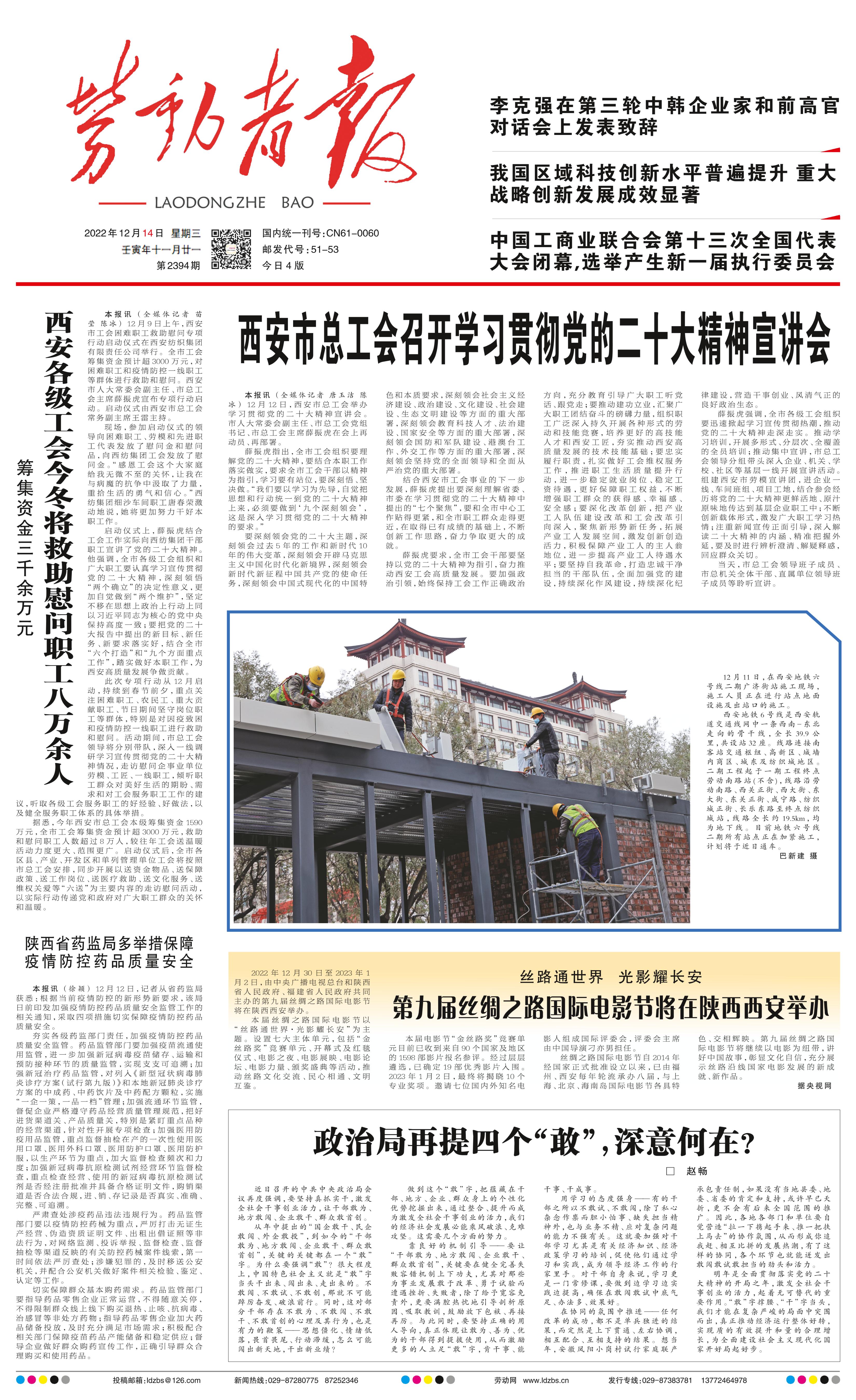 本报讯 (全媒体记者 苗莹 陈冰)12月9日上午,西安市工会困难职工救助慰问专项行动启动仪式在西安纺织集团有限责任公司举行。全市工会筹集资金预计超3000万元,对困难职工和疫情防控一线职工等群体进行救助和慰问。西安市人大常委会副主任、市总工会主席薛振虎宣布专项行动启动。启动仪式由西安市总工会常务副主席王雷主持。 现场,参加启动仪式的领导向困难职工、劳模和先进职工代表发放了慰问金和慰问品,向西纺集团工会发放了慰问金。“感恩工会这个大家庭给我无微不至的关怀,让我在与病魔的抗争中汲取了力量,重拾生活的勇气和信心。”西纺集团细沙车间职工唐春荣激动地说,她将更加努力干好本职工作。 启动仪式上,薛振虎结合工会工作实际向西纺集团干部职工宣讲了党的二十大精神。他强调,全市各级工会组织和广大职工要认真学习宣传贯彻党的二十大精神,深刻领悟“两个确立”的决定性意义,更加自觉做到“两个维护”,坚定不移在思想上政治上行动上同以习近平同志为核心的党中央保持高度一致;要把党的二十大报告中提出的新目标、新任务、新要求落实好,结合全市“六个打造”和“九个方面重点工作”,踏实做好本职工作,为西安高质量发展争做贡献。 此次专项行动从12月启动,持续到春节前夕,重点关注困难职工、农民工、重大贡献职工、节日期间坚守岗位职工等群体,特别是对因疫致困和疫情防控一线职工进行救助和慰问。活动期间,市总工会领导将分别带队,深入一线调研学习宣传贯彻党的二十大精神情况,走访慰问企事业单位劳模、工匠、一线职工,倾听职工群众对美好生活的期盼、需求和对工会服务职工工作的建议,听取各级工会服务职工的好经验、好做法,以及健全服务职工体系的具体举措。 据悉,今年西安市总工会本级筹集资金1590万元,全市工会筹集资金预计超3000万元,救助和慰问职工人数超过8万人,较往年工会送温暖活动力度更大、范围更广。启动仪式后,全市各区县、产业、开发区和单列管理单位工会将按照市总工会安排,同步开展以送资金物品、送保障政策、送工作岗位、送医疗救助、送文化服务、送维权关爱等“六送”为主要内容的走访慰问活动,以实际行动传递党和政府对广大职工群众的关怀和温暖。