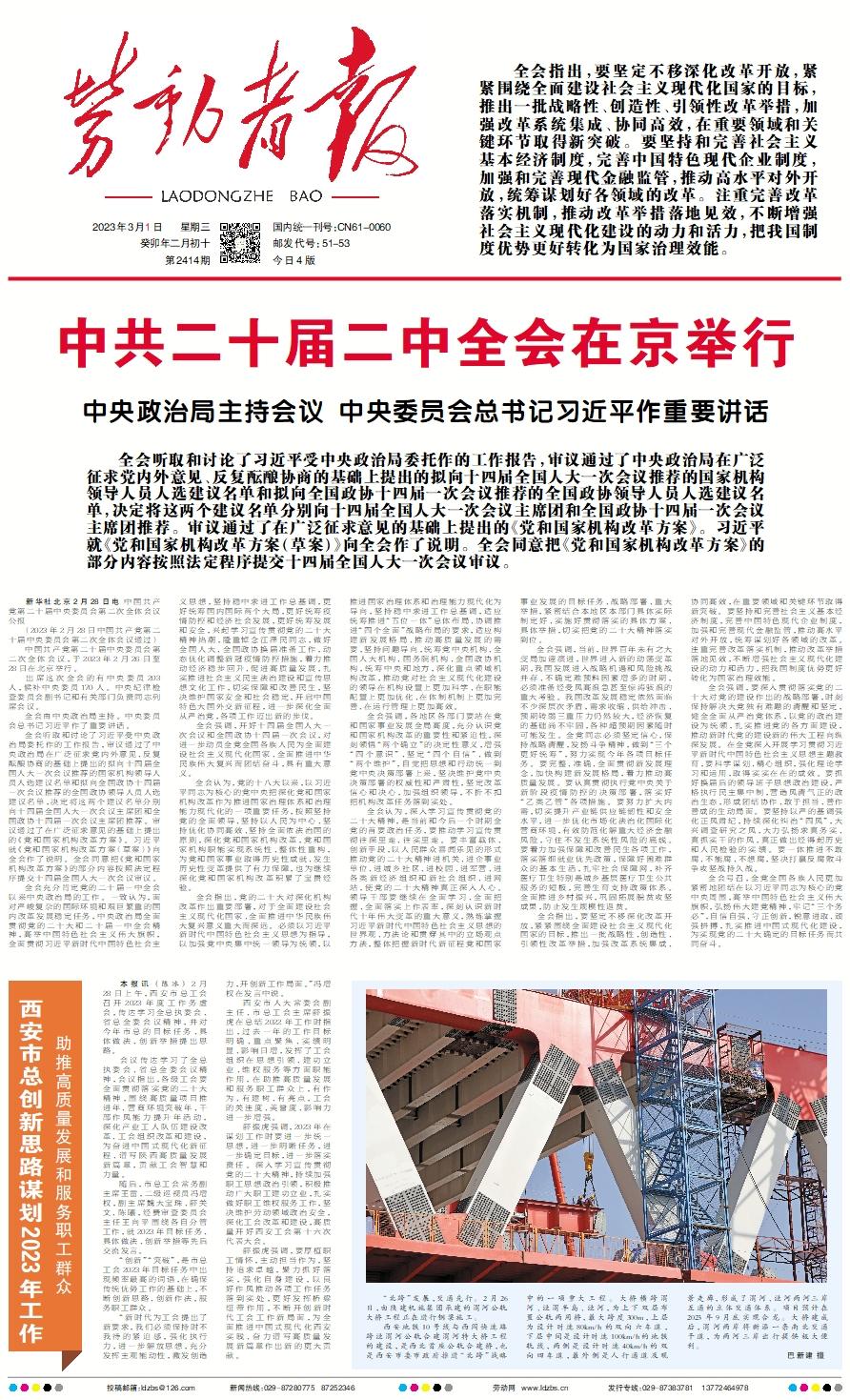 新华社北京2月28日电 中国共产党第二十届中央委员会第二次全体会议公报 (2023年2月28日中国共产党第二十届中央委员会第二次全体会议通过) 中国共产党第二十届中央委员会第二次全体会议,于2023年2月26日至28日在北京举行。 出席这次全会的有中央委员203人,候补中央委员170人。中央纪律检查委员会副书记和有关部门负责同志列席会议。 全会由中央政治局主持。中央委员会总书记习近平作了重要讲话。 全会听取和讨论了习近平受中央政治局委托作的工作报告,审议通过了中央政治局在广泛征求党内外意见、反复酝酿协商的基础上提出的拟向十四届全国人大一次会议推荐的国家机构领导人员人选建议名单和拟向全国政协十四届一次会议推荐的全国政协领导人员人选建议名单,决定将这两个建议名单分别向十四届全国人大一次会议主席团和全国政协十四届一次会议主席团推荐。审议通过了在广泛征求意见的基础上提出的《党和国家机构改革方案》。习近平就《党和国家机构改革方案(草案)》向全会作了说明。全会同意把《党和国家机构改革方案》的部分内容按照法定程序提交十四届全国人大一次会议审议。 全会充分肯定党的二十届一中全会以来中央政治局的工作。一致认为,面对严峻复杂的国际环境和艰巨繁重的国内改革发展稳定任务,中央政治局全面贯彻党的二十大和二十届一中全会精神,高举中国特色社会主义伟大旗帜,全面贯彻习近平新时代中国特色社会主义思想,坚持稳中求进工作总基调,更好统筹国内国际两个大局,更好统筹疫情防控和经济社会发展,更好统筹发展和安全,兴起学习宣传贯彻党的二十大精神热潮,隆重悼念江泽民同志,做好全国人大、全国政协换届准备工作,动态优化调整新冠疫情防控措施,着力推动经济稳步回升、促进高质量发展,扎实推进社会主义民主法治建设和宣传思想文化工作,切实保障和改善民生,坚决维护国家安全和社会稳定,开启中国特色大国外交新征程,进一步深化全面从严治党,各项工作迈出新的步伐。 全会强调,开好十四届全国人大一次会议和全国政协十四届一次会议,对进一步动员全党全国各族人民为全面建设社会主义现代化国家、全面推进中华民族伟大复兴而团结奋斗,具有重大意义。 全会认为,党的十八大以来,以习近平同志为核心的党中央把深化党和国家机构改革作为推进国家治理体系和治理能力现代化的一项重要任务,按照坚持党的全面领导、坚持以人民为中心、坚持优化协同高效、坚持全面依法治国的原则,深化党和国家机构改革,党和国家机构职能实现系统性、整体性重构,为党和国家事业取得历史性成就、发生历史性变革提供了有力保障,也为继续深化党和国家机构改革积累了宝贵经验。 全会指出,党的二十大对深化机构改革作出重要部署,对于全面建设社会主义现代化国家、全面推进中华民族伟大复兴意义重大而深远。必须以习近平新时代中国特色社会主义思想为指导,以加强党中央集中统一领导为统领,以推进国家治理体系和治理能力现代化为导向,坚持稳中求进工作总基调,适应统筹推进“五位一体”总体布局、协调推进“四个全面”战略布局的要求,适应构建新发展格局、推动高质量发展的需要,坚持问题导向,统筹党中央机构、全国人大机构、国务院机构、全国政协机构,统筹中央和地方,深化重点领域机构改革,推动党对社会主义现代化建设的领导在机构设置上更加科学、在职能配置上更加优化、在体制机制上更加完善、在运行管理上更加高效。 全会强调,各地区各部门要站在党和国家事业发展全局高度,充分认识党和国家机构改革的重要性和紧迫性,深刻领悟“两个确立”的决定性意义,增强“四个意识”、坚定“四个自信”、做到“两个维护”,自觉把思想和行动统一到党中央决策部署上来,坚决维护党中央决策部署的权威性和严肃性,坚定改革信心和决心,加强组织领导,不折不扣把机构改革任务落到实处。 全会认为,深入学习宣传贯彻党的二十大精神,是当前和今后一个时期全党的首要政治任务,要推动学习宣传贯彻往深里走、往实里走。要丰富载体、创新手段,以人民群众喜闻乐见的形式推动党的二十大精神进机关、进企事业单位、进城乡社区、进校园、进军营、进各类新经济组织和新社会组织、进网站,使党的二十大精神真正深入人心。领导干部要继续在全面学习、全面把握、全面落实上作表率,深刻认识新时代十年伟大变革的重大意义,熟练掌握习近平新时代中国特色社会主义思想的世界观、方法论和贯穿其中的立场观点方法,整体把握新时代新征程党和国家事业发展的目标任务、战略部署、重大举措,紧密结合本地区本部门具体实际制定好、实施好贯彻落实的具体方案、具体举措,切实把党的二十大精神落实到位。 全会强调,当前,世界百年未有之大变局加速演进,世界进入新的动荡变革期,我国发展进入战略机遇和风险挑战并存、不确定难预料因素增多的时期,必须准备经受风高浪急甚至惊涛骇浪的重大考验。我国改革发展稳定依然面临不少深层次矛盾,需求收缩、供给冲击、预期转弱三重压力仍然较大,经济恢复的基础尚不牢固,各种超预期因素随时可能发生。全党同志必须坚定信心,保持战略清醒,发扬斗争精神,做到“三个更好统筹”,努力实现今年