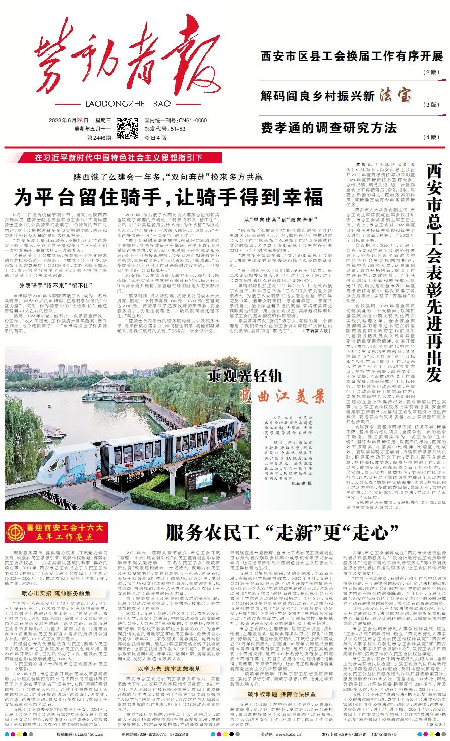 6月22日是传统佳节端午节。当天,在陕西西安碑林区,蓝骑士配送行业联合工会(以下简称蓝骑士工会)的外卖骑手们收到了一份特殊的节日礼物:行业工会根据送餐车车型定制的防晒、防汗和防潮坐垫以及大桶的夏日饮料和粽子。 “给爱车装上夏日新装备,不怕出汗了”“送外卖一骑一整天,有这个垫子舒服多了”……骑手们一边吃着粽子、喝着饮料,一边聊着天。 这是蓝骑士工会成立后,根据骑手个性化需求贴心维权服务的一个缩影。 “成立工会一年多,陕西饿了么建成基层工会组织8个,2107名骑手加入工会,真正为平台留住了骑手,让骑手得到了幸福。”蓝骑士工会主席张涛说。外卖骑手“招不来”“留不住” 申锋涛于2018年入职陕西饿了么,成为一名外卖骑手。如今37岁的申锋涛,已是骑手队伍的“中坚力量”。同时,作为骑手中的“优选队长”,他还管理着40人左右的团队。 然而,2022年以前,他不止一次想要重新找一份工作。“收入不稳定,工作强度大且风险高,晋升空间小,地位低没面子……”申锋涛说出了许多骑手的苦衷。 2020年,作为饿了么西北公共事务总监的张涛也发现了问题的严峻性,“骑手招不来、留不住”。之后,以“外卖送餐员为什么走,为什么留”为核心切入点,他们展开了一次深入调研,结论显示:“外卖送餐员是一份‘三头受气’的工作。” “由于用餐时间高度集中,在商户之间取送的优先顺序,容易导致商户有情绪、产生矛盾;用户希望送餐更快、更近,就可能对骑手产生意见和不满;骑手一旦被投诉举报,会受到站点扣绩效等各种惩罚,即使被误解,申诉也很麻烦。”张涛说,“大多数骑手坦言这份工作只是临时过渡性的,一旦找到‘新出路’会直接离开。” 西安饿了么物流负责人蔺立表示,那几年,陕西饿了么外卖骑手季度留存率只有71%,每月有近30%骑手离开岗位,企业最忙碌的就是人力资源部门。 “那段时间,招人特别难,找劳务公司成本大大提高,招每一个骑手需要800元~1500元,甚至高达2000元。新骑手来了还要找老骑手带教、安全服务培训、优化送餐路径……最后很可能还留不住。”蔺立说。 “蓝骑士代表平台的服务履约能力以及服务水平,是平台核心竞争力,如何留住骑手、将他们凝聚起来,是我们破局的关键。”张涛在一次会议中说。从“单向建会”到“双向奔赴” “陕西饿了么覆盖全省10个地市的78个县区主城区,日活跃骑手近万名,如何在他们中推动建会入会工作?”陕西饿了么总部工作地点在碑林区文艺路街道,这也成了该街道总工会主席符小琳2021年下半年时常琢磨的事。 “想再多不如直接做。”文艺路街道总工会决定,由副主席姜婷直接去陕西饿了么公司协商交流。 “第一次近乎吃了闭门羹,没有任何结果。第二次见到相关负责人,但他们对工会不了解,对工会成立后能做什么充满疑问。”姜婷回忆。 事情的转机发生在2022年3月7日,在陕西饿了么楼下,碑林区总举办“三八”妇女节关爱女骑手活动,为饿了么女骑手们送去暖心礼包、节日鲜花及口罩。看着女骑手们一手拿着鲜花,一手高举手机自拍,脸上洋溢着幸福的笑容,张涛和姜婷充满默契地相视一笑,楼上会议室,姜婷趁机详细讲解了工会的基本情况和作用职能。 等姜婷第四次“登门”饿了么,张涛的第一个问题是:“我们平台企业的工会该如何建?”按捺住内心的激动,姜婷知道“事成了”。 原来,之前姜婷给他们反复讲工会工作后,张涛等企业负责人也在积极学习,他们详细了解了工会相关章程和职能,并去相关平台企业学习,最终一致认为,工会将作为一个必要的补充体系,增强骑手的幸福感、荣誉感和归属感,凝聚骑手的同时为企业提高稳岗率。 之后,随着双方交流深入,陕西饿了么相关负责人也积极前往区和街道两级工会交流、学习,早日建会成了大家的共同心愿。 2022年5月10日,碑林区蓝骑士配送行业联合工会成立,1000名外卖骑手现场加入工会,选举张涛担任联合工会主席,工会采用“1+N”模式,由平台物流负责人担任副主席,主城区8个配送商代表、骑手代表等担任工会委员。 陕西饿了么的建会受到各级工会的重视与支持,当年冬季,省财贸金融轻工工会向各市财贸(金融、轻工)工会以及涉及新就业形态劳动者的企业下拨送温暖资金46万元,其中5万元专门用于为蓝骑士工会外卖骑手购买防疫用品和防寒的帽子、围巾、手套等。“当时我们创新性地将‘新就业形态劳动者服务季’与元旦春节送温暖活动相结合,助力系统外卖员群体安全工作、温暖过冬、幸福生活。”省财贸金融轻工工会主席赵亮说。 同时,在陕西省财贸金融轻工工会、西安市财贸工会的共同指导下,最终探索出3种适合外卖骑手建会入会的混合模式,参加街道或行业联合工会、服务商自主建会、建立饿了么蓝骑士联合工会。在这3种模式和“能建尽建”原则的指导下,结合不同地市、区县的业务和团队实际情况,西安饿了么成立联合工会,同时推进鄠邑、周至、蓝田、高陵等郊县区代理商完成自主建会;咸阳、宝鸡饿了么则通过上级工会的支持帮助建会;同时也及时协同组建、加入当地外卖配送行业联合工会。充分享受“娘家人”的温暖 “今天我在白金广场小区送餐时,发现有住户将电动车推进电梯,在自己的楼层私拉电线充电,有很大的安全隐患,希望得到重视。” “收到,已第一时间告知业务会,谢