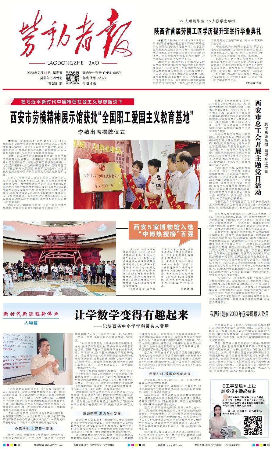 本报讯 (全媒体记者 孙雯 苗莹) 7月11日,全国职工爱国主义教育基地揭牌仪式在西安市劳模精神展示馆举行,省总工会常务副主席王军,西安市委副书记、市委政法委书记李婧出席并揭牌,市人大常委会副主任、市总工会主席薛振虎致辞。 李婧一行参观了市劳模精神展示馆,详细了解劳动模范的先进事迹。李婧指出,要充分发挥劳模精神展示馆的作用,持续加强职工思想政治引领,大力弘扬劳模精神、劳动精神和工匠精神,营造尊重劳动、尊重劳模的浓厚氛围,激励和动员全市广大劳动者为创新推进中国式现代化西安实践贡献智慧和力量。 日前,中华全国总工会命名的第二批全国职工爱国主义教育基地名单正式公布,西安市劳模精神展示馆入选。市劳模精神展示馆于2021年建成,是西北地区首座劳模精神展示馆,展馆以劳模贡献、劳模精神及西安发展为主题,采用文字图片展板、实物展示、场景复原及声、光、电等多媒体高科技展陈手段,全景式地展现了各个历史时期全国和陕西、西安等各级劳动模范的先进事迹,从中也折射出西安城市的发展历程。 西安市市劳模及职工代表,市总工会班子成员及机关、直属单位党员干部代表参加揭牌仪式。