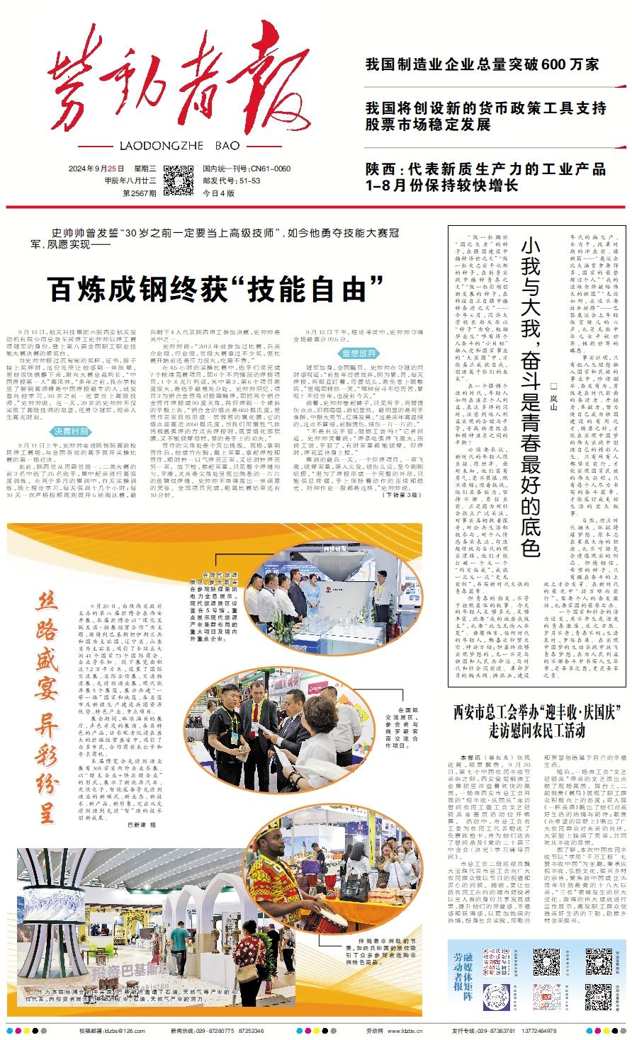在现代能源展区,参会嘉宾在参观陕煤集团电力全息展示。现代能源展区设置在5号馆,重点展示现代能源产业集群布局的重大项目及境内外重点企业。 在国际交流展区,参会者与俄罗斯客商交流合作项目。 伴随着非洲鼓的节奏,加纳共和国的展位吸引了众多参观者选购非洲特色商品。 作为本届丝博会的主宾国,巴基斯坦邀请了石油、天然气等产业的40位代表,向投资者展示巴基斯坦矿业、石油、天然气产业的潜力。 9月20日,由陕西省政府主办的第八届丝博会在西安开展,本届丝博会以“深化互联互通·拓展经贸合作”为主题,邀请到巴基斯坦伊斯兰共和国为主宾国,辽宁省、山东省为主宾省,吸引了全球五大洲41个国家73个国际商会、企业等参加。线下展览面积达7.2万平方米,设置了国际交流展、省际合作展、交通物流展、先进制造业展、现代能源展5个展区,展示共建“一带一路”国家和地区、各省区市及新疆生产建设兵团资源优势、特色产业、重点项目。 展会期间,琳琅满目的展厅、声色并茂的展演、各具特色的产品,让参观者沉浸在盛大的丝路经贸盛宴中,吸引了众多市民、合作商前来打卡和寻求商机。 本届博览会先进制造业展有305家省内外企业参展。以“链主企业+供应链企业”的形式,展示了新能源汽车、光伏电子、智能装备等先进制造业的新模式、新业态、新技术、新产品、新形象,突出从先进制造到先进“智”造的技术创新成果。 巴新建 摄