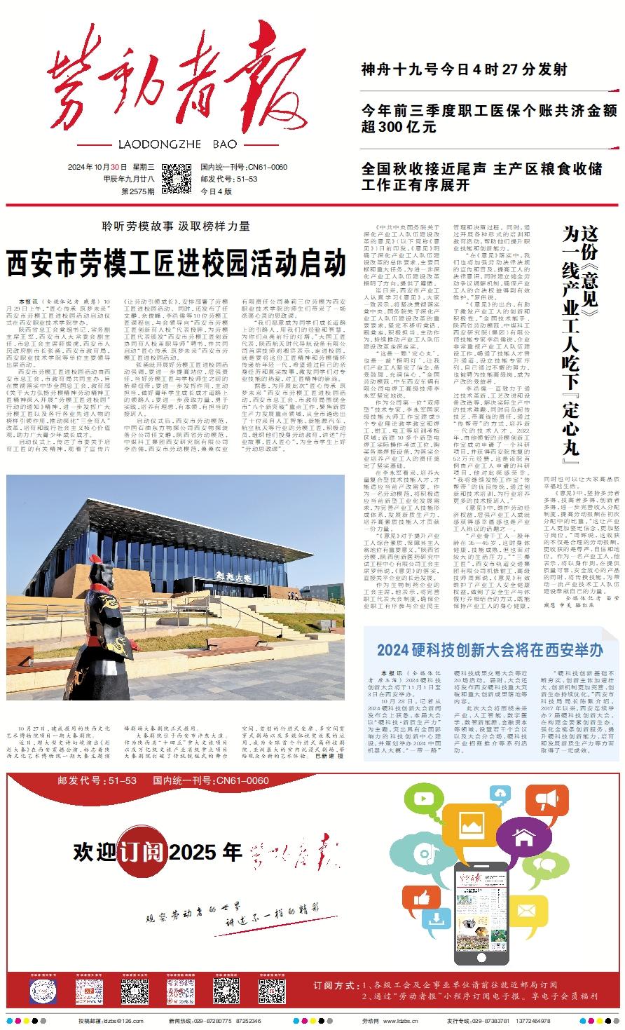 本报讯 (全媒体记者 臧慧) 10月29日上午,“匠心传承 筑梦未来”西安市劳模工匠进校园活动启动仪式在西安职业技术学院举办。 陕西省总工会党组书记、常务副主席王军,西安市人大常委会副主任、市总工会主席薛振虎,西安市人民政府副市长张涌,西安市教育局,西安职业技术学院等单位主要领导出席活动。 西安市劳模工匠进校园活动由西安市总工会、市教育局共同主办,旨在贯彻落实中华全国总工会、教育部《关于大力弘扬劳模精神劳动精神工匠精神深入开展“劳模工匠进校园”行动的通知》精神,进一步发挥广大劳模工匠以及各行各业先进人物的榜样引领作用,推动深化“三全育人”改革,培育和践行社会主义核心价值观,助力广大青少年成长成才。 启动仪式上,传达了市委关于培育工匠的有关精神,观看了宣传片《让劳动引领成长》,安排部署了劳模工匠进校园活动。同时,还发布了任文静、佘俊峰、李浩儒等10位劳模工匠课程包,与会领导向“西安市劳模工匠创新育人校”代表授牌,为劳模工匠代表颁发“西安市劳模工匠创新协同育人校兼职导师”聘书,并共同启动“匠心传承 筑梦未来”西安市劳模工匠进校园活动。 张涌就开展好劳模工匠进校园活动强调,要进一步提高站位、增强责任,当好劳模工匠与学校师生之间的桥梁纽带;要进一步发挥作用、主动担当,做好青年学生成长成才道路上的领路人;要进一步汲取力量、勇于实践,培养有理想、有本领、有担当的接班人。 启动仪式后,西安市劳动模范、中国石油东方物探公司西安物探装备分公司任文静,陕西省劳动模范、中煤科工集团西安研究院有限公司李浩儒,西安市劳动模范、桑桑农业有限责任公司桑莉三位劳模为西安职业技术学院的师生们带来了一场涤荡心灵的思政课。 “我们愿意成为同学们成长道路上的引路人,用我们的经验和智慧,为你们点亮前行的灯塔。”大国工匠代表,陕西航天时代导航设备有限公司首席技师刘湘宾表示,走进校园,就是要将这份工匠精神和劳模情怀传递给年轻一代,希望通过自己的亲身经历和真实故事,激发同学们对专业技能的热爱,对工匠精神的崇尚。 据悉,为开展此次“匠心传承 筑梦未来”西安市劳模工匠进校园活动,西安市总工会、市教育局围绕全市“八个新突破”重点工作,聚焦新质生产力发展重点领域,从全市遴选出了十位来自人工智能、新能源汽车、航空航天等行业的劳模工匠,积极动员、组织他们投身劳动教育,讲述“行业故事、匠人匠心”,为全市学生上好“劳动思政课”。