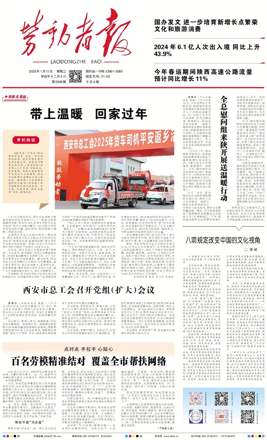 开栏的话 2025年是“十四五”规划的收官之年,是进一步全面深化改革、推进中国式现代化的关键之年。新春佳节即将来临之际,《劳动者报》记者深入工厂车间、田间地头、社区巷尾,用镜头捕捉那些平凡而又不凡的瞬间,用文字记录那些真挚而又动人的情感。捕捉每一个故事蕴含着的时代脉动,记录每一张笑脸映照出的生活美好。今日起,本报开设“新春走基层”栏目,敬请垂注。 1月14日春运首日,西安传化丝路公路港务物流园里红色拱门上,“‘致敬劳动者 温暖回家路’西安市2025年货车司机平安返乡活动”两行大字格外醒目,100名货车司机早早收拾好行囊,满怀期待,即将驾驶车辆踏上回家的征程。 这是西安市总工会联合西安广播电视台、西安市物流行业工会联合会共同举办的2025年“致敬劳动者 温暖回家路”货车司机平安返乡活动现场。现场,市总工会为返乡货车司机们赠送了加油卡、过年大礼包。 近年来,西安市总工会坚持开展“四季送”、平安返乡、法律援助、农民工免费健康体检、劳动技能竞赛等工会品牌工作,让广大工友共享西安社会发展福利。最近两周,西安市总工会还将集中人力物力,以免费高铁、爱心货车等方式,通过送加油卡、送关怀礼包、送新春祝福,集体欢送大家平安返乡过年,做广大工友最信赖的贴心人、知心人和娘家人。 记者看到,百名货车司机中有部分货车司机身披印有“全国最美货车司机”“优秀党员货车司机”“省级劳动技能竞赛技术能手”“市级劳动技能竞赛技术能手”等红色绶带。 “加入工会3年来,我最深刻的感受就是,工会是爱护、呵护我们广大货车司机的‘娘家人’。”有着20多年驾驶经验的“优秀共产党员”王新余说,这次活动是西安送给他们最好的新年礼物,不但举办了欢送仪式,还送了油卡和大礼包,让他们体面地回家过年。“我一定把党和政府的温暖带回家,带给身边人。” “今天你们要回到温暖的家,那里有你们牵挂人,更有牵挂你们的人。辛苦一年了,大家回家过年一定要平平安安、健健康康、快快乐乐、顺顺利利!”西安市人大常委会副主任、市总工会主席薛振虎叮嘱货车司机,工会是广大工友最信赖的贴心人、知心人和娘家人,当权益受到损害时,一定要找工会组织,同时希望大家能够积极参与西安建设,心系西安发展,讲好西安故事。 “登车、系安全带、点火、出发回家……”随着指挥人员一声令下,100辆不同长度、不同颜色的货车,驶过物流园内的红色拱门,货车司机带着“娘家人”送来的加油卡、大礼包、新春福袋,向省内外各地“家”的方向驶去,奔向那盏为自己而亮的灯。“工会太暖心了,过完年后,我们将立即返程,继续努力,为西安城市的发展贡献自己的力量。” 当车辆驶过拱门时,送行的工会干部们向货车司机挥手告别,货车司机们也摇下车窗,挥手示意,脸上洋溢着回家过年的喜悦。 据悉,西安市物流行业工会联合会成立以来,在市总工会的指导下,在市建设交通工会的直接领导下,致力于为货车司机解难题、办实事、做好事。2024年,工会联合会牵头,与多个部门单位、平台方及货车司机,共同制定了《网络货车运营服务规范》;作为全国典型“党工共建”品牌,持续开展“红色方向盘”党员货车司机选树;在重要节日继续慰问伤残货车司机,每周三坚持为货车司机开展公益法律维权服务等,目前已带动近17000多名司机加入工会组织。 全媒体记者 苗莹 实习生 刘佳欣