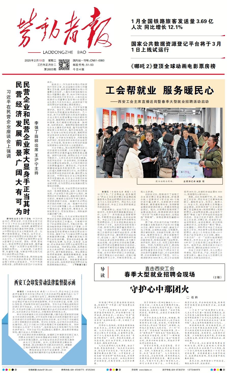图为招聘会现场。               全媒体记者 臧慧  摄   本报讯 (全媒体记者 臧慧) 2月18日下午,“工会帮就业 服务暖民心”西安工会主席劳模工匠直播送岗暨春季大型就业招聘活动启动仪式在土门工人文化宫举行。西安市人大常委会副主任、市总工会主席薛振虎宣布活动启动。    薛振虎指出,就业乃民生之基。他表示,市委市政府高度重视就业工作,出台了一系列稳就业政策和举措,不断拓宽就业渠道,优化就业服务。市总工会已连续多年举办春季大型招聘活动,工会主席直播送岗也连续举办了4年。此次活动将延续到3月底,持续为西安高质量发展助力,为每一位求职者圆梦。他要求全市各级工会组织全力做好就业服务,征集更多的优质企业、提供更好的就业岗位,通过线上、线下、帮扶等各种手段引导就业者实现求职意愿;全力提升就业技能,通过深化劳动技能竞赛、重点项目建功竞赛和各种培训活动,让求职者不断增强自身能力和本领;进一步优化就业环境,推动企业民主管理,全方位维护好职工合法权益,让职工既能有心仪的岗位,还能心情舒畅地学习工作,不断完善自我,实现人生梦想。    启动仪式后,现场进行了首场工会主席劳模工匠直播送岗,薛振虎在线上直播间对3家企业485个岗位进行重点推介,向求职者介绍招聘需求、薪资福利等内容,及时解答直播间求职者的留言,并提供相关就业建议。随后,在招聘会现场开展了走播送岗活动,根据求职者的需求“面对面”为其推介就业岗位,实现送岗“零距离”。首场直播浏览量超60万人次。    据了解,同步进行的线下招聘会涉及重点支柱及新兴产业的210家重点企业,提供10236个岗位,涵盖生产加工制造、交通物流运输、生物医药、酒店餐饮服务、文体教育传媒、房产建筑业、能源环保化工、财会金融等行业,其中民营企业超过八成。为更好的做好服务,现场还设置了就业帮扶、法律服务、建会入会、农民工服务等咨询台。同时,为规范企业用工,推动构建和谐劳动关系,西安市总工会劳动法律监督委员会印发了《西安市工会劳动法律监督提示函》,对企业依法招聘、劳动保障等进行了规范。当日入场求职者达4000余人,用工企业收到简历3475份,达成初步就业意向1881人,现场签约入职109人。    据悉,2025年按照中央、省、市就业工作安排,西安市总工会聚焦转岗职工、高校毕业生、农民工、脱贫人口、失业人员、就业困难人员等重点就业群体,将陆续开展“工会主席劳模工匠直播送岗+网络招聘会+现场招聘会+就业帮扶直播+就业服务下基层”等线上线下多种途径的就业服务活动。市总工会班子成员、部分区总工会主席、劳模工匠,将走进企业、走进现场会、走进直播间,通过网络直播的形式,实现岗位“靶向”推送。在此基础上,依托西安市总工会就业服务云平台,举办春季大型网络视频招聘会,设立1个市级主会场+24个区县产业开发区工会分会场,提供一个多月的“一对一”实时在线视频招聘服务,并同步在全总“职工之家”APP的“工会服务职工就业帮扶云”发布。截至目前,网络会参会企业已达1040家,提供就业岗位28736个。    市总工会班子成员,市人社局分管领导,部分区县、产业、开发区工会主要负责人,重点企业人力资源代表及求职人员参加启动仪式。