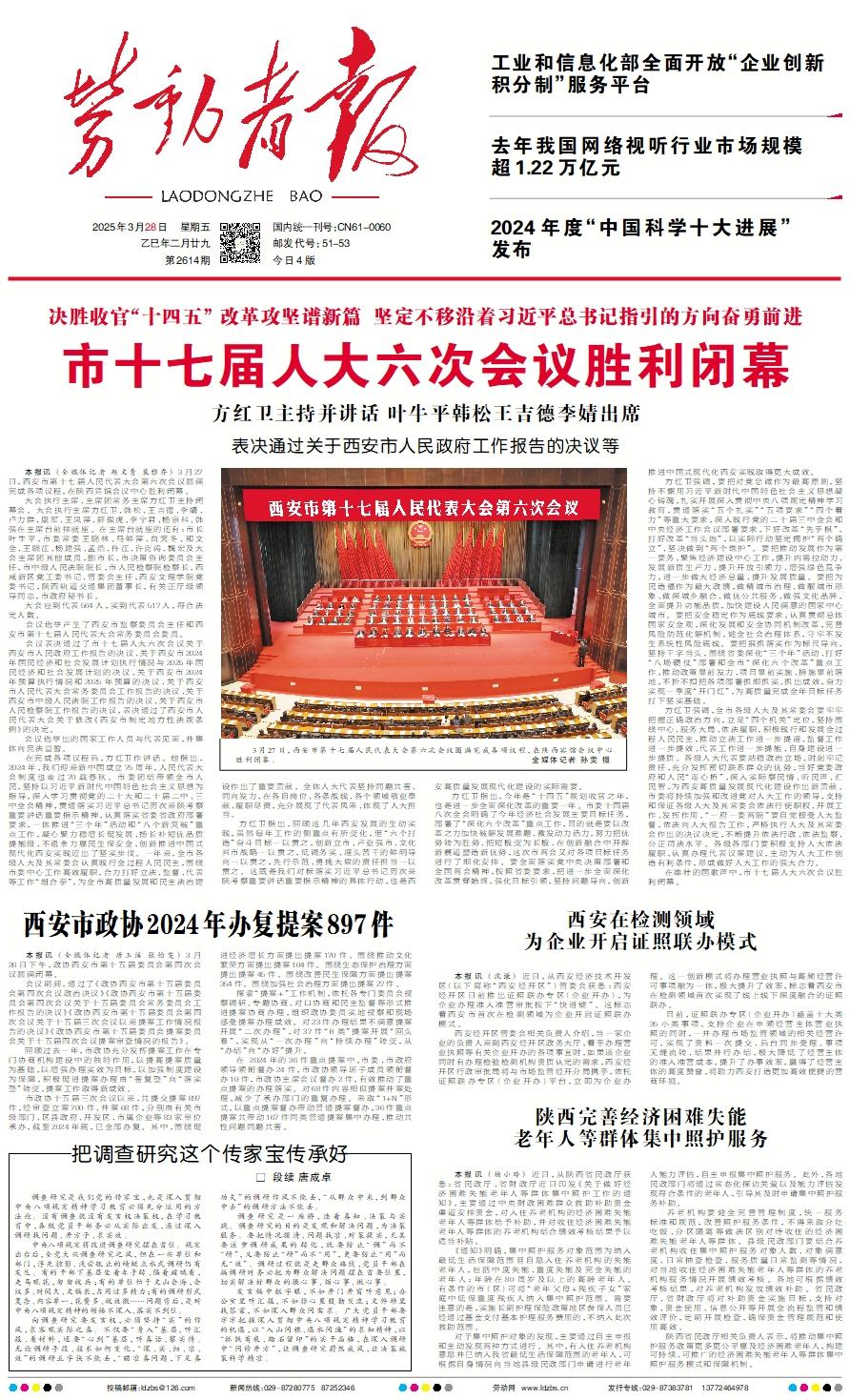 本报讯 (全媒体记者 唐玉洁 张怡雯) 3月26日下午,政协西安市第十五届委员会第四次会议圆满闭幕。 会议期间,通过了《政协西安市第十五届委员会第四次会议政治决议》《政协西安市第十五届委员会第四次会议关于十五届委员会常务委员会工作报告的决议》《政协西安市第十五届委员会第四次会议关于十五届三次会议以来提案工作情况报告的决议》《政协西安市第十五届委员会提案委员会关于十五届四次会议提案审查情况的报告》。 回顾过去一年,市政协充分发挥提案工作在专门协商机构建设中的独特作用,以提高提案质量为基础,以增强办理实效为目标,以加强制度建设为保障,积极促进提案办理由“答复型”向“落实型”转变,提案工作取得新成效。 市政协十五届三次会议以来,共提交提案897件,经审查立案700件、并案68件,分别由有关市级部门、区县政府、开发区、市属企业等83家单位承办,截至2024年底,已全部办复。其中,围绕促进经济增长方面提出提案170件。围绕推动文化繁荣方面提出提案104件。围绕生态保护治理方面提出提案45件。围绕改善民生保障方面提出提案354件。围绕加强社会治理方面提出提案27件。 探索“提案+”工作机制,依托各专门委员会视察调研、专题协商、对口协商和民主监督等形式推进提案协商办理,组织政协委员实地视察和现场感受提案办理成效。对23件办理结果不满意提案开展“二次办理”,对37件“B类”提案开展“回头看”,实现从“一次办理”向“持续办理”转变,从“办结”向“办好”提升。 在 2024年的36件重点提案中,市委、市政府领导领衔督办24件,市政协领导班子成员领衔督办10件,市政协主席会议督办2件,有效推动了重点提案的办理落实。对68件内容相似提案并案处理,减少了承办部门的重复办理。采取“1+N”形式,以重点提案督办带动普通提案督办,36件重点提案共带动167件同类普通提案集中办理,推动共性问题同题共答。