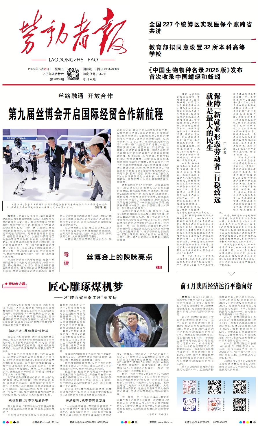 5月21日,在第九届丝绸之路国际博览会暨中国东西部合作与投资贸易洽谈会上,参观者在西安区域科技中心展区与交互机器人互动。                 巴新建 摄    本报讯 (巴岩) 5月21日,第九届丝绸之路国际博览会暨中国东西部合作与投资贸易洽谈会在西安开幕。本届丝博会以“‌丝路融通·开放合作‌”为主题,持续深化与丝绸之路经济带沿线和“一带一路”共建国家全方位经贸投资合作,助力陆海丝绸之路联动发展和促进向西开放,邀请新疆维吾尔自治区、福建省担任主宾省,加速推动西部地区与东中部地区产业链、供应链、创新链融合互补,促进区域间良性互动和共同发展,推动高质量共建“一带一路”取得更丰硕成果。会期5天。来自40多个国家和地区的嘉宾汇聚一堂,深化互联互通,扩大经贸合作,推动丝博会成为共建“一带一路”高能级开放平台。    本届丝博会有9大专题活动,包括中欧班列全球合作伙伴对接洽谈活动、中国—中亚丝路电商深化合作活动、低空经济高质量发展系列活动、秦创原科技成果系列路演推介活动、国际地理标志产品交易活动、高品质认证服务暨陕西精品推介活动、国际产学研用合作会议暨教育合作交流活动、跨境金融合作交流活动、苏陕东西部企业家创新发展对接活动等。    本届丝博会主宾省、相关省区市以及省内各市区还将举办系列贸易投资交流活动,全面展示各方形象、优势、产业及项目,开展投资洽谈、大宗贸易和项目签约。    本届丝博会围绕国际省际交流合作、陕西比较优势、重点产业和消费促进等主题,设置丝路优品展、省际合作展、科技创新展、低空经济展、交通物流展、文旅消费展等6个展区,展示多元合作成果,总展示面积7.2万平方米。丝路优品展集中展示“一带一路”共建国家和地区、中亚五国的资源优势、特色产业、特色商品、地理标志产品和外贸商品等;省际合作展展示我国各省区市和新疆生产建设兵团整体形象、投资环境、合作领域,拓展省际区域合作共建成果;科技创新展突出秦创原创新驱动平台成果,展现新质生产力与科技成果转化成效;低空经济展吸引200余家参展企业,展示100余架航空器,并设置沉浸式体验场景;交通物流展聚焦多式联运体系,推动“通道+贸易+产业”融合发展;文旅消费展通过文化科技、非遗国潮等板块,呈现陕西文旅产业集群高质量发展成果。    依托丝博会扩大“朋友圈”。在本届丝博会上,陕西省各市(区)根据各自产业特点和自然禀赋,聚焦现代能源、先进制造、文化旅游、战略性新兴产业、现代农业、基础设施、商贸物流、节能环保等多个领域,包装重点项目1000个左右。在此基础上,陕西省发展改革委精心筛选了149个重点推介项目,投资总额超2000亿元,进一步增强丝博会扩开放、引外资的特色吸引力。    丝博会已成功举办八届,据统计,八年来,丝博会展销特色商品累计达3万多种,观众人数超过103万人次。累计签订利用外资项目合同总投资额567.76亿美元,签订国内联合项目合同总投资额97139.25亿元。作为连接“一带一路”共建国家的重要平台,丝博会从最初的区域型展会发展为兼具国际影响力的综合性开放窗口,持续以开放包容的姿态,汇聚全球资源、激发合作活力,在高质量共建“一带一路”的征程中书写互利共赢的新篇章。