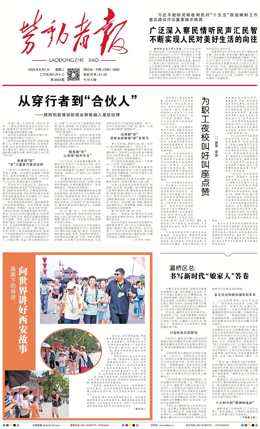快递小哥、外卖骑手、网约车司机……新就业群体是美好生活的守护者,是城市的“毛细血管”,也是经济社会高质量发展的重要力量。    如何将这群奔跑在城市的穿行者,转化为基层治理的“合伙人”?    陕西各地以党建为纽带,用服务凝聚人心,不断打造友好场景,强化服务保障,充分发挥新就业群体流动性强、服务覆盖面广等特点,鼓励引导新就业群体融入基层治理,画好共建共治共享“同心圆”。党建凝“新”“新”力量参与基层治理    “因为户口等原因,我孩子就近入学成了难题。市快递行业党委了解情况后,多方协调解决了孩子上学的问题,我发自内心地感谢党组织。”7月30日,在宝鸡,圆通快递员王建辉说。    自2022年6月成立以来,宝鸡市快递行业党委持续开展“四季关爱行动”,通过组织专场招聘会、免费健康体检、法律咨询活动等,切实增强快递从业者的职业荣誉感和社会归属感,让“流动的身影”更好地融入城市生活。    新兴领域发展到哪里,党的组织和工作就跟进到哪里。宝鸡市聚焦“统得起、兜得住、管得好”,优化市委“两新”工委运行机制,构建党委组织部门牵头抓总、社会工作部门指导推动、行业管理部门齐抓共管、街道社区属地管理的工作格局。同时,强化“管行业也要管党建”责任,依托职能部门在非公有制企业、社会组织等领域组建11个行业党委,搭建起“市—县(区)—镇(街道)—社区(园区)”新兴领域党建体系;建成1个市级党群服务中心暨社会组织孵化基地、新建提升13个县区党群服务中心、在重点镇(街道)建立党群服务站点,形成“1+13+N”的三级党群服务格局;最终,组建起129个政治立场强、文明程度强、服务效能强、发展活力强的“四强”党组织。    不只是宝鸡市。近年来,陕西省持续探索新就业群体党建工作,以党建更好凝聚和服务新就业群体,引领新业态高质量发展,党在新兴领域的号召力凝聚力影响力不断扩大。服务暖“新”让幸福“触手可及”    “天气炎热,大家注意防暑防晒,合理安排工作时长”“这里面有茶叶、毛巾等防暑降温用品”……7月18日,略阳县新兴领域夏季“送清凉”专项慰问活动走进一线网点,将“清凉礼包”送到快递员手中。    “防暑物资很及时、很实用。工作人员还详细询问我们的收入保障、权益维护等情况,认真收集意见建议。我觉得很暖心。”快递员陈朝阳说。    连日来,略阳县精准聚焦新就业群体急难愁盼,由县委社会工作部牵头联合多部门组建慰问组,深入外卖站点、快递分拣中心、主播工作室等场所慰问新就业群体,听取他们对城市服务优化、基层治理创新的意见建议,协调解决相关问题。    用“心”暖“新”。今年,陕西出台《2025年“暖新护航”新就业形态劳动者关爱十条》,通过发放礼包、义诊、“提技提薪”等方式,进一步加强对新就业群体的关心关爱。    不仅如此,省委社会工作部还联合各地整合辖区党群服务中心、社区便民中心等阵地建立暖“新”驿站,为新就业群体提供就餐、休息、权益维护等服务,统筹推动全省暖“新”行动,不断完善权益保障,优化提升友好场景建设,引导各界加强关心关爱新就业群体。如今,全省已建起5500个暖“新”驿站,为新就业群体搭建“温馨港湾”。治理融“新”新就业群体有“家”更有为    穿上工作服,戴好头盔,骑上电动车,骑手柳超超开始了一天的工作。    忙碌间隙,柳超超随手拍下路面破损的照片,发到西安市阎良区新华路街道兴飞社区微信群。社区工作人员及时回应,安排人员到现场解决。    作为骑手的柳超超,还有一个新身份——社区“流动网格员”。    “社区聘请我们骑手参与基层治理。我主要承担反映、上报在走街串巷中发现的问题隐患,为行动不便老人送餐等工作。”柳超超说。    新华路街道地处阎良主城区,每天数百名骑手、快递员穿梭在大街小巷。    过去,这些新就业群体常面临“休息难、饮水难”等问题。新华路街道党工委坚持党建引领,聚焦新就业群体需求,建成“航城·驿家”5个、爱“新”驿站10个、骑手友好社区2个,为辖区新就业群体提供休息、充电等12项常态化服务,并通过一系列暖“新”举措,激发新就业群体活力,营造尊重、理解、关爱新就业群体的良好氛围。    暖“新”服务,聚“新”共治。    现在,一座座爱“新”驿站已不仅是服务新就业群体的阵地,更成为基层治理的新支点。    延安市为骑手及快递员颁发基层治理观察员聘书;铜川市立足群体需求,探索“党建引领+暖心服务+协同治理”……陕西省各地积极探索,推动越来越多新就业群体融入基层治理,为基层发展注入源源不断的活力。                       (刘曌琼 刘枫)