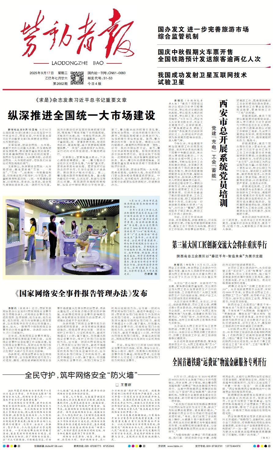 新华社北京9月15日电 9月16日出版的第18期《求是》杂志将发表中共中央总书记、国家主席、中央军委主席习近平的重要文章《纵深推进全国统一大市场建设》。 文章强调,建设全国统一大市场,是党中央作出的重大决策,不仅是构建新发展格局、推动高质量发展的需要,而且是赢得国际竞争主动权的需要。我国作为全球第二大消费市场,必须把全国统一大市场建设好,增强我们从容应对风险挑战的底气。 文章指出,纵深推进全国统一大市场建设,基本要求是“五统一、一开放”。“五统一”,就是统一市场基础制度,特别是实现产权保护、公平竞争、质量标准等制度的统一;统一市场基础设施,打通物流、资金流、信息流,健全现代商贸流通体系;统一政府行为尺度,地方在推动经济发展特别是招商引资时,哪些能干哪些不能干有明确规矩,不能各行其是;统一市场监管执法,明确市场监管行政处罚裁量基准,一把尺子量到底;统一要素资源市场,促进自由流动、高效配置,减少资源错配和闲置浪费。“一开放”,就是持续扩大开放,实行对内对外开放联通,不搞封闭运行。 文章指出,要聚焦重点难点,下决心清除顽瘴痼疾。第一,着力整治企业低价无序竞争乱象。“内卷”重灾区,要依法依规有效治理。更好发挥行业协会自律作用,引导企业提升产品品质。推动落后产能有序退出。第二,着力整治政府采购招标乱象。重点整治最低价中标、以次充好、利益勾连等突出问题。规范政府采购和招标投标,加强对中标结果的公平性审查。第三,着力整治地方招商引资乱象。要制定全国统一的地方招商引资行为清单,明确鼓励和禁止的具体行为。加强招商引资信息披露。第四,着力推动内外贸一体化发展。畅通出口转内销路径,提高国内国际标准一致性,培育一批内外贸优质企业。第五,着力补齐法规制度短板。持续开展规范涉企执法专项行动。健全有利于市场统一的财税体制、统计核算制度和信用体系。第六,着力纠治政绩观偏差。完善高质量发展考核体系和干部政绩考核评价体系。 文章强调,建设全国统一大市场,既是攻坚战,也是持久战,各地区各部门要从政治和全局高度抓好落实。中央和地方、地方和地方、政府和企业、企业和企业都要加强协调配合,形成推进合力。