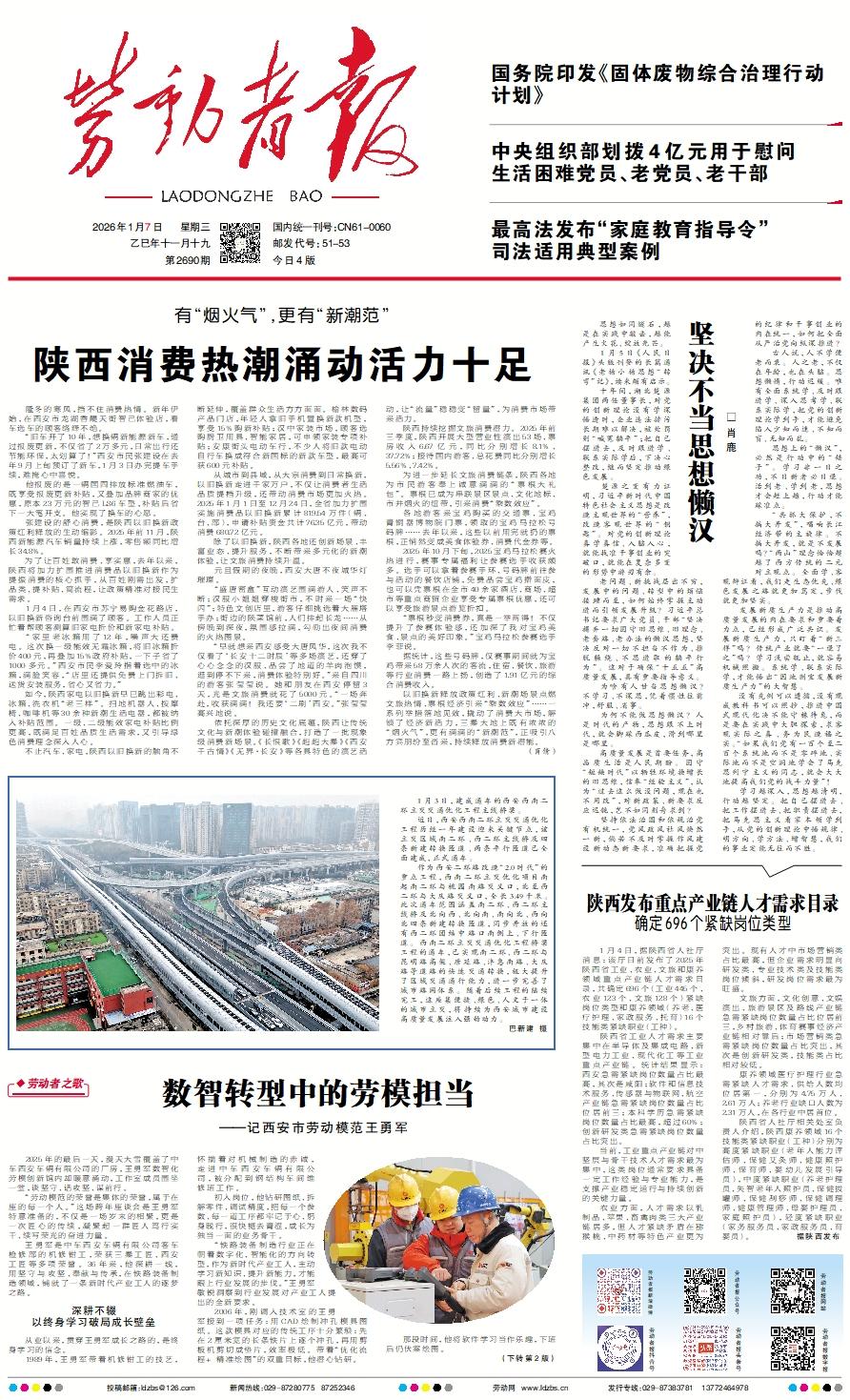 2025年的最后一天,漫天大雪覆盖了中车西安车辆有限公司的厂房,王勇军数智化劳模创新馆内却暖意涌动,工作室成员围坐一堂,谈坚守、话攻坚、谋前行。    “劳动模范的荣誉是集体的荣誉,属于在座的每一个人。”这场跨年座谈会是王勇军特意准备的,不仅是一场岁末的相聚,更是一次匠心的传续,凝聚起一群匠人笃行实干、续写荣光的奋进力量。    王勇军是中车西安车辆有限公司客车检修部的机修钳工,荣获三秦工匠、西安工匠等多项荣誉。36年来,他深耕一线,用坚守与攻坚、奉献与传承,在铁路装备制造领域,铺就了一条新时代产业工人的逐梦之路。深耕不辍以终身学习破局成长壁垒    从业以来,贯穿王勇军成长之路的,是终身学习的信念。    1989年,王勇军带着机修钳工的技艺,怀揣着对机械制造的赤诚,走进中车西安车辆有限公司,被分配到钢结构车间维修班工作。    初入岗位,他钻研图纸、拆解零件、调试精度,把每一个参数、每一道工序都牢记于心、躬身践行,很快褪去青涩,成长为独当一面的业务骨干。    “铁路装备制造行业正在朝着数字化、智能化的方向转型,作为新时代产业工人,主动学习新知识、提升新能力,才能跟上行业发展的步伐。”王勇军敏锐洞察到行业发展对产业工人提出的全新要求。    2006年,刚调入技术室的王勇军接到一项任务:用CAD绘制冲孔模具图纸。这款模具对应的传统工序十分繁琐:先在2厘米宽的长条铁片上逐个冲孔,再用剪板机剪切成垫片,效率极低。带着“优化流程+ 精准绘图”的双重目标,他潜心钻研。    那段时间,他将软件学习当作乐趣,下班后仍伏案绘图。    凭借不懈努力,王勇军不仅完成了图纸绘制,还主动包揽后续全流程工作——上车床车削零件,上刨床加工模具座,完成热处理、油石打磨等工序。最终,他亲手打造的冲孔剪切一体模具,将生产效率提升了十倍以上。    这一次突破,让王勇军坚定了技术求索的方向。    不懂三维建模,他就自学SolidWorks等建模软件,实现了从二维平面到三维立体的跨越。深知PLC编程是设备智能化改造的核心密钥,他自费购买网络课程,反复观看教程,直到问题彻底解决……    三十余载日积月累,王勇军成功完成了从传统工匠到数智化技术达人的蜕变,这份终身学习的坚守,也为他后续百余项技术改造、攻坚破局筑牢了坚实根基。攻坚破局以实干之力破解生产难题    “制造业的高质量发展,从来不是单一维度的突破,而是传承、创新、协作多轮驱动的结果。”自2015年王勇军所领衔的技能大师工作室成立,他便将“匠心传承”定为核心使命。    “盯着痛点找办法。”王勇军常说,生产中的每一个难题都是创新的起点,只有解决实际问题、创造真实价值的创新,才是有意义的创新。秉持这一理念,王勇军带领工作室累计完成技术创新项目190余项,为公司创造价值超千万元。    在他看来,一线工匠的创新未必需要“高大上”的技术,只要紧盯生产需求、怀揣解决问题的决心,就能让创新真正服务生产、创造价值。    公司推进25T型客车试修时,台车静载试验装置是关键设备。他带领团队仅用6天完成装备设计,30天内完成安装调试。这套融合机械、液压、数控等多领域技术的工装,填补了公司该类车型检修手段的空白。    2024年6月,工作室升级为数智化劳模创新馆,实现“由室到馆”的内核性跨越。公司依托创新馆成立数智化创新联盟,王勇军扛起了数字化产线建设与数字化人才培养的重任。    得益于终身学习的积淀,当16台工业机器人进驻车间,交由他负责建设自动化焊接线时,他早已储备好充足技能。他带领团队攻坚生产工艺、焊接技术、产线集成、工装设计制作与编程等多个难关,在短时间内完成产线建设并顺利投产。    这份在实战中锤炼出的攻坚硬功,很快又在紧急任务中得到检验。    2024年底一个严冬的夜晚,尾翼切割机器人项目迎来最终攻坚,任务要求翌日清晨8点必须启用。而此时,王勇军的女儿正面临临产。他匆匆将家人送医,只留下一句“公司有紧急攻坚任务,我必须回去”,便奔赴岗位。    寒夜里,他带领两名团队成员坚守生产线,一丝不苟地调试设备、优化程序,奋战至凌晨。最终成功攻克难关,尾翼切割机器人如期投入生产。薪火相传以赤诚之心延续工匠精神    “我个人本事再大,也修不了那么多车。但把技术传给年轻人,就能形成源源不断的力量。”王勇军坦言,让劳模精神、劳动精神、工匠精神代代相传,是他最大的心愿。    作为深耕一线的技术标杆与工作室领衔人,王勇军始终牢记传技育人的使命。通过专题培训、现场实操授课等方式,他毫无保留地将自身从业经验、数智化技能与攻坚思路传授给青年职工,累计带出40余名徒弟,其中多人已成长为技能专家。    在徒弟心中,王勇军是严师,更是良友。工作中,他严于律己更严管队伍,无论是图纸标注、代码编写,还是工序调试,都要求精益求精,绝不马虎;生活里,他对团队的每名成员都关怀备至,时刻牵挂青年职工的食宿起居、职场适应与成长困惑,主动答疑解惑、指引方向,用一言一行诠释着劳模精神的真谛。    “跟着王工,步步有收获,次次有提升!”“王工的荣誉让我们坚信,每一份坚守与努力,终会被看见、被铭记。”“向劳模看齐,传匠心力量,为企业赋能!”……跨年的那场座谈