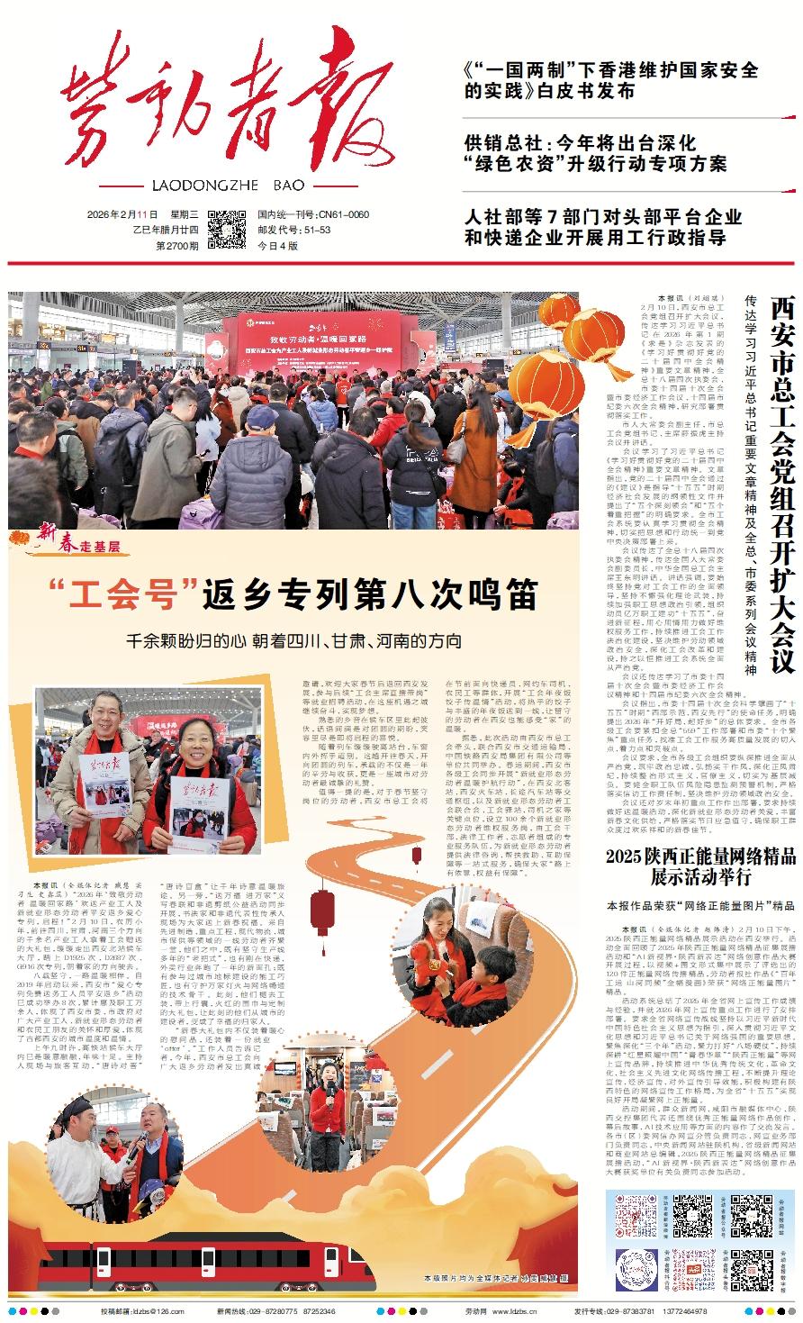 本报讯 (全媒体记者 臧慧 实习生 史鑫蕊) “2026年‘致敬劳动者 温暖回家路’欢送产业工人及新就业形态劳动者平安返乡爱心专列,启程!”2月10日,农历小年,前往四川、甘肃、河南三个方向的千余名产业工人拿着工会赠送的大礼包,缓缓走出西安北站候车大厅,踏上D1925次、D2687次、G916次专列,朝着家的方向驶去。    八载坚守,一路温暖相伴。自2019年启动以来,西安市“爱心专列免费送务工人员平安返乡”活动已成功举办8次,累计惠及职工万余人,体现了西安市委、市政府对广大产业工人、新就业形态劳动者和农民工朋友的关怀和厚爱,体现了古都西安的城市温度和温情。    上午九时许,高铁站候车大厅内已是暖意融融、年味十足。主持人现场与旅客互动,“唐诗对答”“唐诗盲盒”让千年诗意温暖旅途。另一旁,“送万福 进万家”义写春联和非遗剪纸公益活动同步开展,书法家和非遗代表性传承人现场为大家送上新春祝福。来自先进制造、重点工程、现代物流、城市保供等领域的一线劳动者齐聚一堂,他们之中,既有坚守生产线多年的“老把式”,也有刚在快递、外卖行业奔跑了一年的新面孔;既有参与过城市地标建设的能工巧匠,也有守护万家灯火与网络畅通的技术骨干。此刻,他们褪去工装,带上行囊,火红的围巾与定制的大礼包,让此刻的他们从城市的建设者,变成了幸福的归家人。    “新春大礼包内不仅装着暖心的慰问品,还装着一份就业‘offer’。”工作人员告诉记者,今年,西安市总工会向广大返乡劳动者发出真诚邀请,欢迎大家春节后返回西安发展,参与后续“工会主席直播带岗”等就业招聘活动,在这座机遇之城继续奋斗、实现梦想。    熟悉的乡音在候车区里此起彼伏,话语间满是对团圆的期盼,笑容里尽是即将启程的喜悦。    随着列车缓缓驶离站台,车窗内外挥手道别。这趟开往春天、开向团圆的列车,承载的不仅是一年的辛劳与收获,更是一座城市对劳动者最诚挚的礼赞。    值得一提的是,对于春节坚守岗位的劳动者,西安市总工会将在节前面向快递员、网约车司机、农民工等群体,开展“工会年夜饭 饺子传温情”活动,将热乎的饺子与丰盛的年夜饭送到一线,让留守的劳动者在西安也能感受“家”的温暖。    据悉,此次活动由西安市总工会牵头,联合西安市交通运输局、中国铁路西安局集团有限公司等单位共同举办。春运期间,西安市各级工会同步开展“新就业形态劳动者温暖护航行动”,在西安北客站、西安火车站、长途汽车站等交通枢纽,以及新就业形态劳动者工会联合会、工会驿站、司机之家等关键点位,设立100余个新就业形态劳动者维权服务岗,由工会干部、法律工作者、志愿者组成的专业服务队伍,为新就业形态劳动者提供法律咨询、帮扶救助、互助保障等一站式服务,确保大家“路上有依靠、权益有保障”。