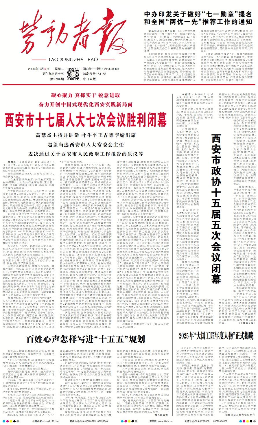 蒿慧杰主持并讲话 叶牛平王吉德李婧出席赵璟当选西安市人大常委会主任表决通过关于西安市人民政府工作报告的决议等 本报讯 (全媒体记者 苗莹 骆红燕) 3月2日上午,西安市第十七届人民代表大会第七次会议圆满完成各项议程,在陕西宾馆会议中心胜利闭幕。 大会应到代表553人,实到代表516人,符合法定人数。 大会主席团常务主席、执行主席蒿慧杰主持闭幕会。大会执行主席赵璟、王吉德、李婧、卢力群、薛振虎、李宁君、杨宗科、韩强在主席台前排就座。 在主席台就座的还有:市长叶牛平,市委常委王晓林、马鲜萍、和文全、王晓江、杨建强、孟浩、仵江、许克涛、张涌、徐云伟及大会主席团其他成员,副市长,市决策咨询委员会主任,市中级人民法院院长,市人民检察院检察长,西咸新区党工委书记、管委会主任,西安文理学院党委书记,陕西轨道交通集团董事长,有关正厅级领导同志,市政府秘书长。 会议表决通过了关于接受有关人员辞职请求的决定、关于西安市人民政府工作报告的决议、关于西安市国民经济和社会发展第十五个五年规划纲要的决议、关于西安市2025年国民经济和社会发展计划执行情况与2026年国民经济和社会发展计划的决议、关于西安市2025年预算执行情况和2026年预算的决议、关于西安市人民代表大会常务委员会工作报告的决议、关于西安市中级人民法院工作报告的决议、关于西安市人民检察院工作报告的决议。 大会进行了选举。赵璟当选西安市第十七届人民代表大会常务委员会主任,王晓林、吕强、贾轶昊、张水利当选西安市第十七届人民代表大会常务委员会副主任。 在与会代表的共同见证下,新当选的西安市第十七届人民代表大会常务委员会主任、副主任进行了宪法宣誓。 在完成各项议程后,蒿慧杰作讲话。蒿慧杰指出,2025年,在习近平总书记亲切关怀下,在党中央坚强领导下,全市广大党员干部群众全面落实党中央决策部署和省委工作要求,一起拼、同心干,经济运行回升向好,民生福祉稳步增进,社会大局和谐稳定,高质量发展迈出坚实步伐,“十四五”圆满收官。这些成绩的取得,根本在于以习近平同志为核心的党中央领航掌舵,在于习近平新时代中国特色社会主义思想科学指引,也凝聚着各级人大和全体人大代表的智慧和汗水。 蒿慧杰指出,站在“十四五”收官和“十五五”开局的历史交汇点上,我们要认真贯彻落实党中央决策部署和省委工作要求,锚定目标、真抓实干,按照市委“四个更加注重”“七个必须坚持”的工作要求,用好“四个综合性战略抓手”,持续深化“三个年”活动,大力发展县域经济、民营经济、开放型经济、数字经济,聚力打好“八场硬仗”,全面提升“三服务”质效,一手抓老问题解决、一手抓新动能培育,统筹推进“十个聚焦”重点工作,确保圆满完成年度各项目标任务,实现“十五五”良好开局。 蒿慧杰强调,实现“十五五”良好开局,务必要在政治忠诚上旗帜鲜明、矢志不渝,把坚定拥护“两个确立”、坚决做到“两个维护”作为最坚定的政治立场、最牢固的政治信念,贯通落实习近平总书记历次来陕考察重要讲话重要指示,始终紧跟总书记令旗走、坚定按照总书记指示办、严格对标党中央部署干,一步一个脚印地把总书记为我们擘画的宏伟蓝图变为美好现实。务必要在推动高质量发展上挺膺担当、主动作为,在促进稳增长上狠下功夫,大力提振消费、扩大有效投资,加大为企业纾困帮扶力度,持续巩固经济回升向好态势;在培育新动能上狠下功夫,坚持创新驱动、大力发展新质生产力,坚持改革推动、深化要素市场化配置、开发区、国资国企、“一网通办”等重点领域改革,坚持开放带动、不断提高“双招双引”质效、加快构建中欧班列经济圈,切实增强新生动力、内生动力和外源动力;在推动内涵式发展上狠下功夫,充分发挥国土空间详细规划“一张图”系统集成功能,高质量推进城市更新,加强历史文化遗产保护传承和活化利用,统筹推进降碳、减污、扩绿、增长,推动城市结构优化、动能转换、品质提升、绿色转型、文脉赓续、治理增效。务必要在改善民生上全心全意、用心用情,牢固树立和践行正确政绩观,顺应人口变化趋势和城市发展规律优化资源配置,加强普惠性、基础性、兜底性民生建设,扎实办好就业创业、教育医疗、养老托幼、住房交通、生态环保等群众关切的实事,着力促进城乡居民增收,扎实推动共同富裕。务必要在维护安全上毫不放松、守牢底线,增强“时时放心不下”的责任感,强化底线思维、极限思维、互联网思维,坚决维护政治和意识形态安全,有效防范化解经济金融风险,提升安全生产、社会治安、防灾减灾等公共安全治理水平,完善社会治理体系,加强信访积案攻坚、推进信访工作法治化,确保人民群众生命财产安全和社会大局和谐稳定。务必要在砥砺作风上从严从实、常抓不懈,保持“使劲跳起来才能摘到桃子”的奋进姿态,秉持“使劲跳起来能够摘到桃子”的务实精神,在破解高质量发展难题、解决群众急难愁盼、应对各类风险挑战中彰显担当作为;推进作风建设常态化长效化,巩固拓展深入贯彻中央八项规定精神学习教育成果,深化干部作风能力提升年活动,力戒形式主义、官僚主义,持续为基层减负赋能,更加清醒坚定地推进反腐败斗争,深化整治群众