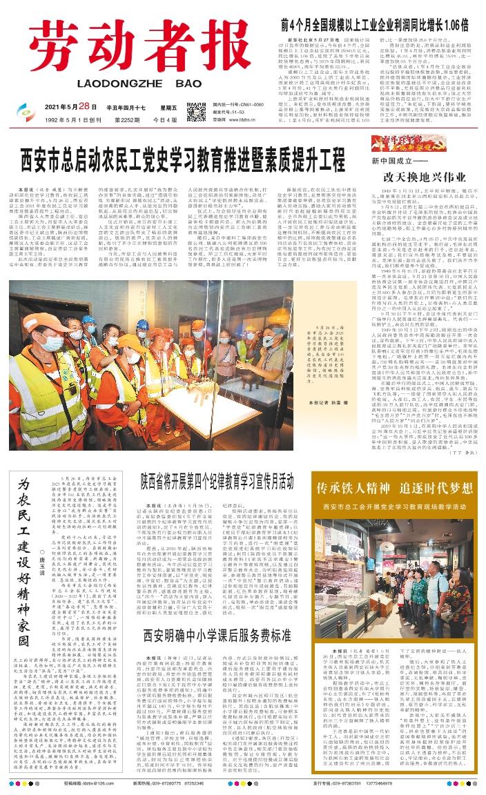 本报讯(记者 臧慧)为不断推动和深化党史学习教育,给农民工搭建素质提升平台,5月26日,西安市总工会2021年度农民工党史学习教育推进暨素质提升工程启动。 陕西省人大常委会副主任、省总工会主席郭大为,西安市人大常委会副主任、市总工会主席薛振虎讲话,雁塔区委书记王斌出席,陕西历史博物馆副馆长、工会主席魏成广致欢迎词,雁塔区人大常委会副主任、区总工会主席翟蒲娣致辞,西安市总工会常务副主席王军主持。 此次活动是西安市总全面贯彻落实中央和省、市委关于党史学习教育的部署要求,扎实开展好“我为群众办实事”的具体实践,通过“增强引领性 关爱新市民 致敬农民工”活动,从最困难的群众入手、从最突出的问题抓起、从最现实的利益出发,切实解决基层的困难事、群众的烦心事。 仪式开始前,来自西安市小寨工人文化宫和西安市边家村工人文化宫的文艺演出队带来了精彩的歌舞演出。悠扬的歌声,优美动人的舞蹈,吸引了不少正在博物馆参观的市民和游客。 当天,市总工会与人民教育科技有限公司现场互换农民工素质提升战略合作协议,通过建立市总工会与人民教育资源共享战略合作机制,打造工会组织政治引领新阵地,动员广大农民工“学史悟思想永远跟党走、奋进新征程当好主力军”。 仪式上,与会领导还向企业和农民工代表赠送党史学习教育书籍、健康体检卡和慰问品。郭大为给陕西历史博物馆西安市总工会职工素质教育基地授牌。 随后,来自中建科工集团西安有限公司、陕建八公司和雁塔区的100名农民工代表走进陕西省历史博物馆参观。环卫工田红霞说,大家平时工作都忙,很多人还是第一次来博物馆参观,真是赶上好时候了! 薛振虎说,在农民工队伍中推进党史学习教育,是贯彻落实党中央决策部署重要举措,是将党史学习教育融入劳动实践、激励大家用劳动谱写新时代追赶超越新篇章的现实要求。全市各级工会要以此为契机,深入开展农民工技能培训促就业计划,进一步完善农民工参与劳动和技能竞赛体制机制,不断提高农民工在劳模中的比例,持续做优致敬建设者系列活动及万名农民工免费体检、劳动证书发放等工作,为农民工在西安这座有温情温度的城市更快适应、更强自立、更好生活彰显责任担当,贡献工会力量。