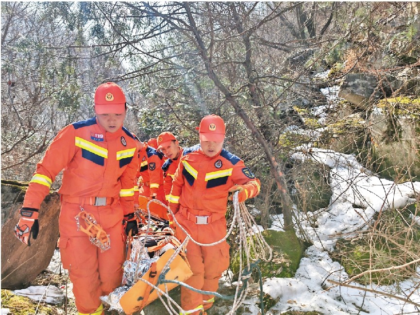 山路因为被积雪掩盖,走起来又湿又滑,但救援人员没有丝毫退缩。经过3个多小时的艰难跋涉,终于在22时50分抵达了被困人员的坠落地点。