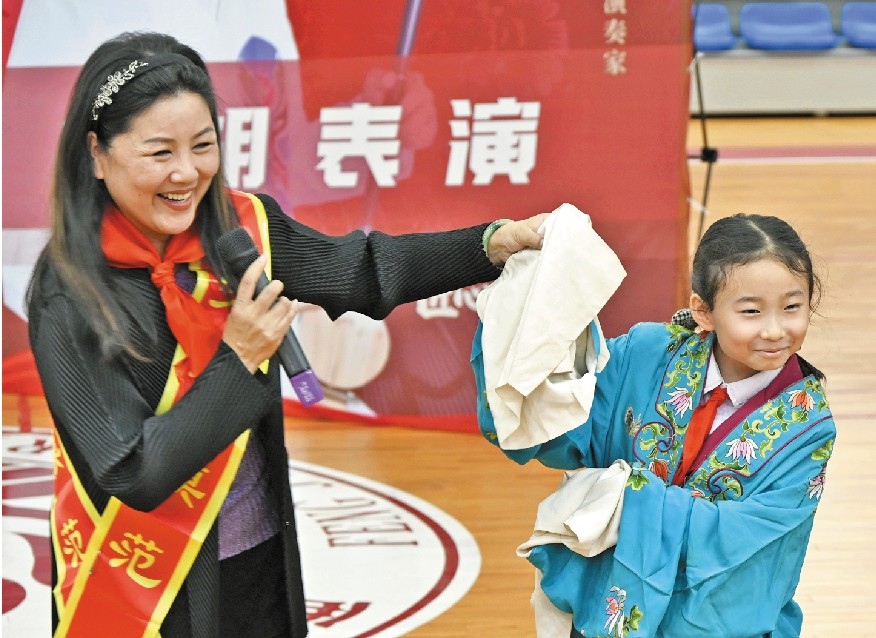 西安市劳动模范,西安三意社有限公司党支部书记侯红琴现场授课,侯红琴不仅讲授了秦腔的基本知识,也展示了高亢激越的唱腔和细腻传神的表演,赢得了师生们阵阵喝彩。