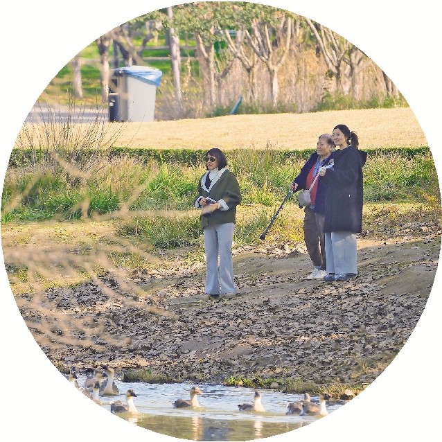 在这些现代建筑群打卡后,我们沿着绿道继续向前。很快,一片更为开阔、野趣盎然的景致映入眼帘——浐灞湿地公园。这里仿佛是城市边缘精心呵护的一块生态绿肺,骑行其中,水波粼粼,芦苇摇曳,成群的水鸟或在滩涂上悠闲踱步,或在水面上翩跹起舞。初冬的阳光为这片湿地铺上了一层暖金色,静谧而祥和,在这里骑行,呼吸着带着水汽的清冽空气,耳畔是自然的风声与鸟鸣,瞬间洗去了都市的喧嚣与疲惫。