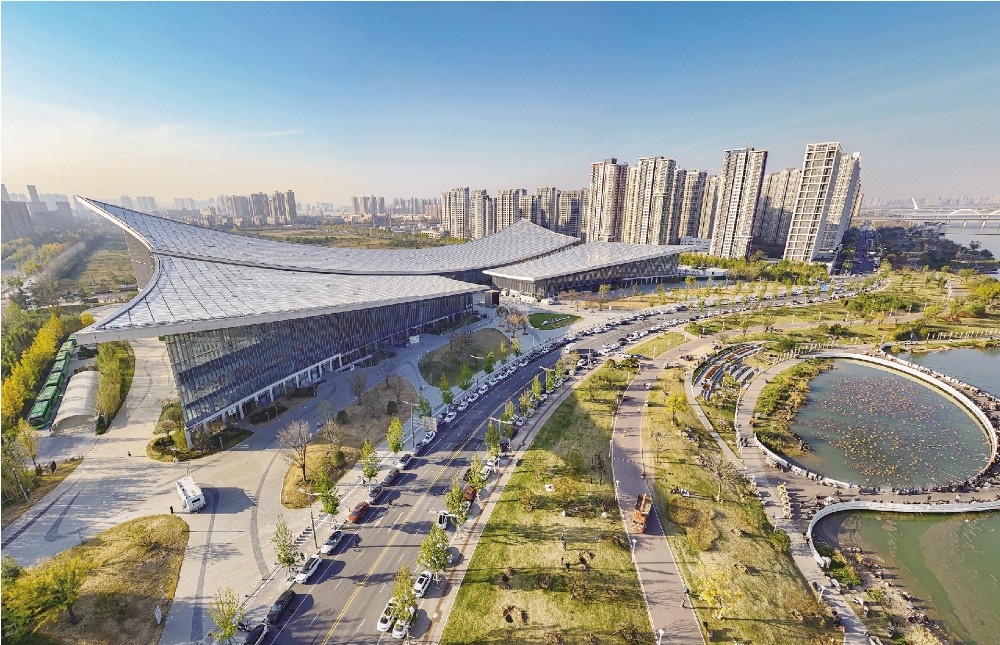 沿渭河绿道向北骑行,西安国际港务区的标志性建筑群渐次展开。首先看到的是建筑风格沉稳大气的长安书院,宛如一本摊开的巨书,与之相望的是造型极具未来感的长安云,线条流畅,充满科技韵律;不远处的西安奥体中心“一场两馆”,在蓝天映衬下显得格外宏伟,犹如巨大的石榴花绽放于河岸。这些现代地标建筑与周边的公园、绿道完美融合,共同构成了一幅展现西安现代化国际形象的生动画卷。