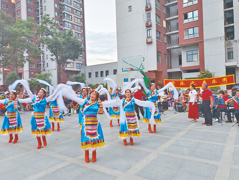 6月12日,在建党100周年之际,西安高铁新城兴隆苑小区广场上,爱乐之声乐团演员正在表演歌伴舞《把好听的歌唱给妈妈听》。这支由西安草滩地区各行业退休职工、农民中的音乐爱好者自愿组成的团队,成立两年来,演出200余场,主唱红歌,歌唱伟大的祖国,为建党100周年献礼。