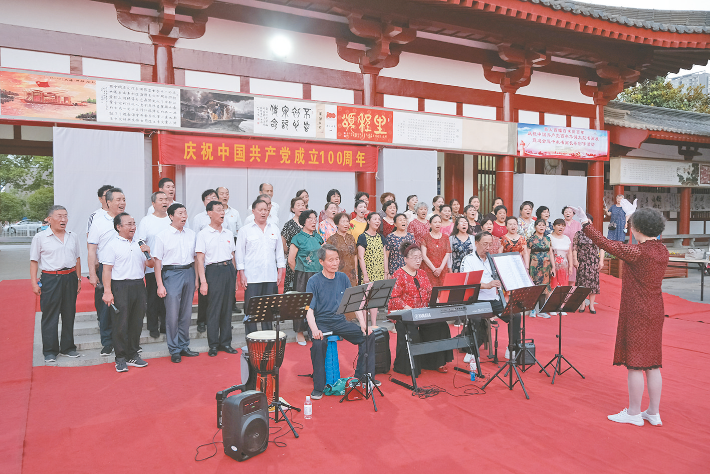6月21日,在西安市丰庆公园,来自附近社区的党员群众汇聚一起,集体合唱《唱支山歌給党听》等红色经典歌曲,用歌声抒发对党的热爱之情,庆祝中国共产党成立100周年。 巴新建 摄