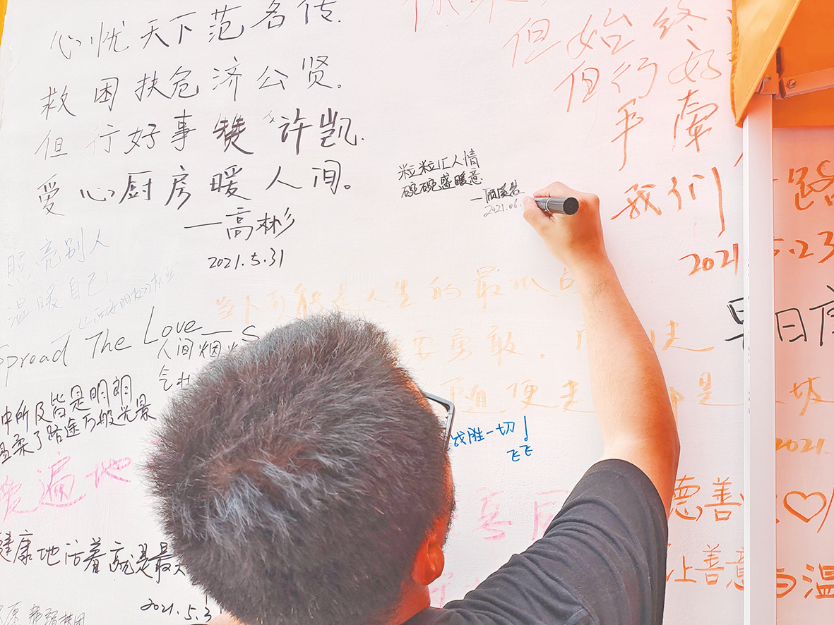 “有你们在,西安更温暖。”“很多在西安看病长期住院的外地人,真的需要这个厨房。许凯,你的行为真伟大!”“小伙年纪不大,心系社会,值得点赞!”德善爱心厨房外留言墙上的这些留言,是对许凯最好的褒奖和鼓励。