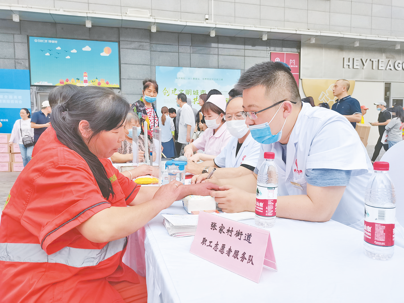 活动仪式上,来自张家村街道的职工志愿者服务队、文艺路街办的李鑫劳动志愿者服务队支起桌子,现场为环卫工人和外卖小哥,以及周边群众现场义诊、免费理发。