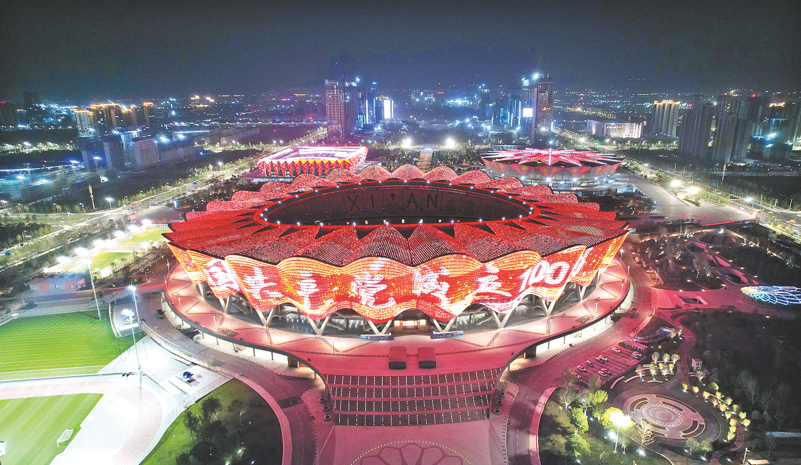 为热烈庆祝中国共产党成立100周年,近日,西安全城多个地标,开启盛大的灯光秀。夜幕降临,光影交错,西安上演了一场贯通历史与现代、融汇传统与时尚的视觉盛宴。图为西安奥体中心的灯光秀。本报记者 孙雯 摄
