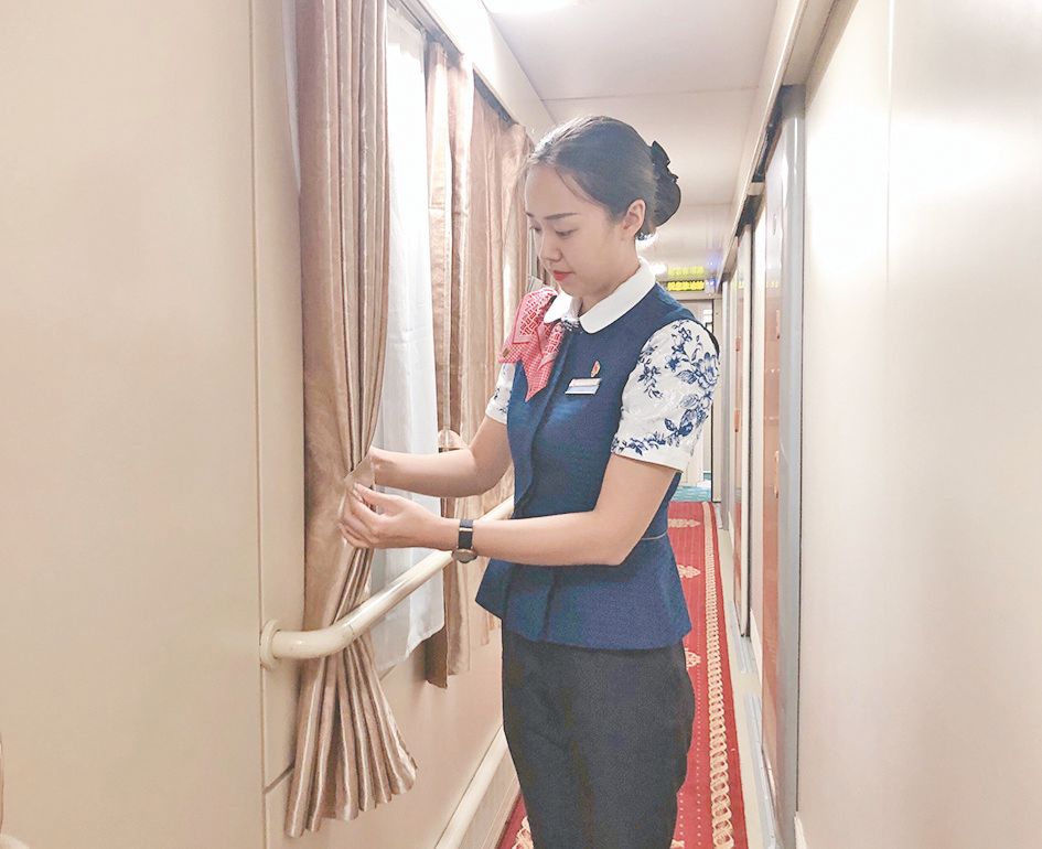 刘思婷常说,为旅客创造舒适的旅途环境是自己的职责。她经常利用折返站间休时间,对车体卫生进行检查,并及时打扫厕所卫生,更换卧具、清理垃圾等,只为给旅客创造舒适、美好的乘车环境。