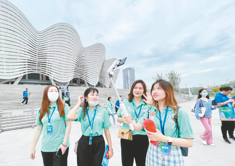 “这个花瓣形的体育场造型好别致!”“快帮我和这么美的体育馆合张影。”