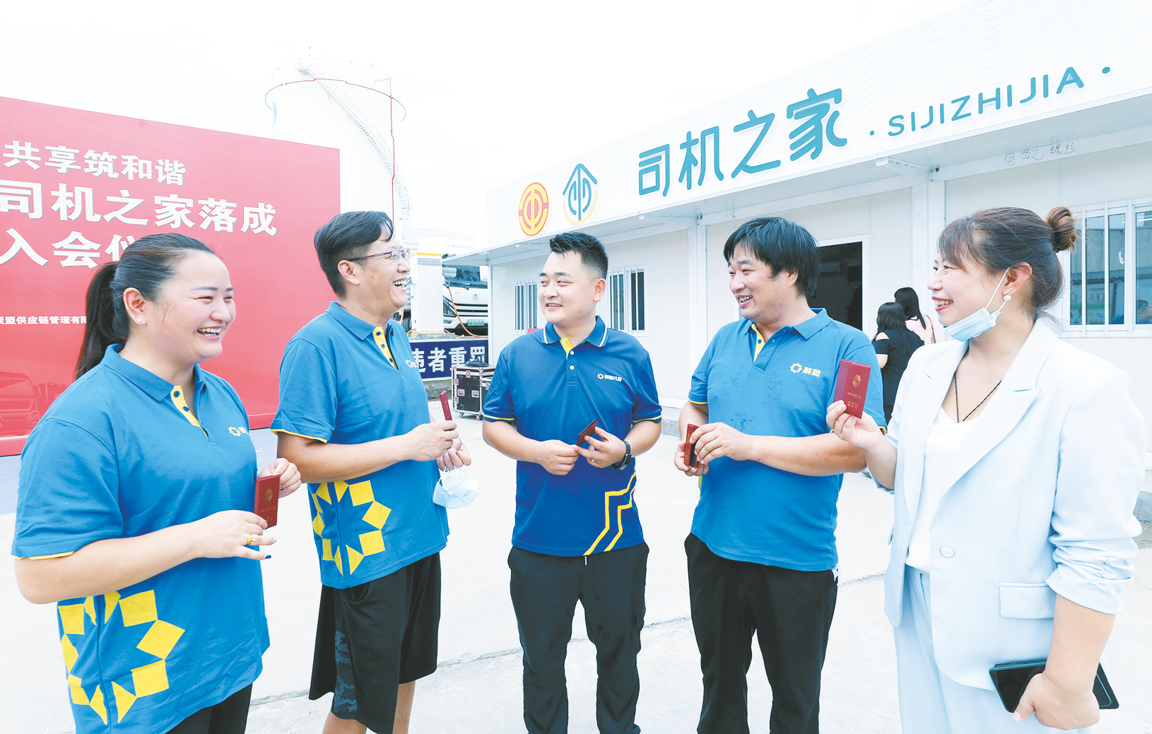 8月4日,西安市物流园区首个司机之家落成。揭牌仪式上,与会领导为新入会会员代表颁发了中华全国总工会会员证,并发放爱心大礼包。 图为新入会会员领到中华全国总工会会员证后在一起互相交流。