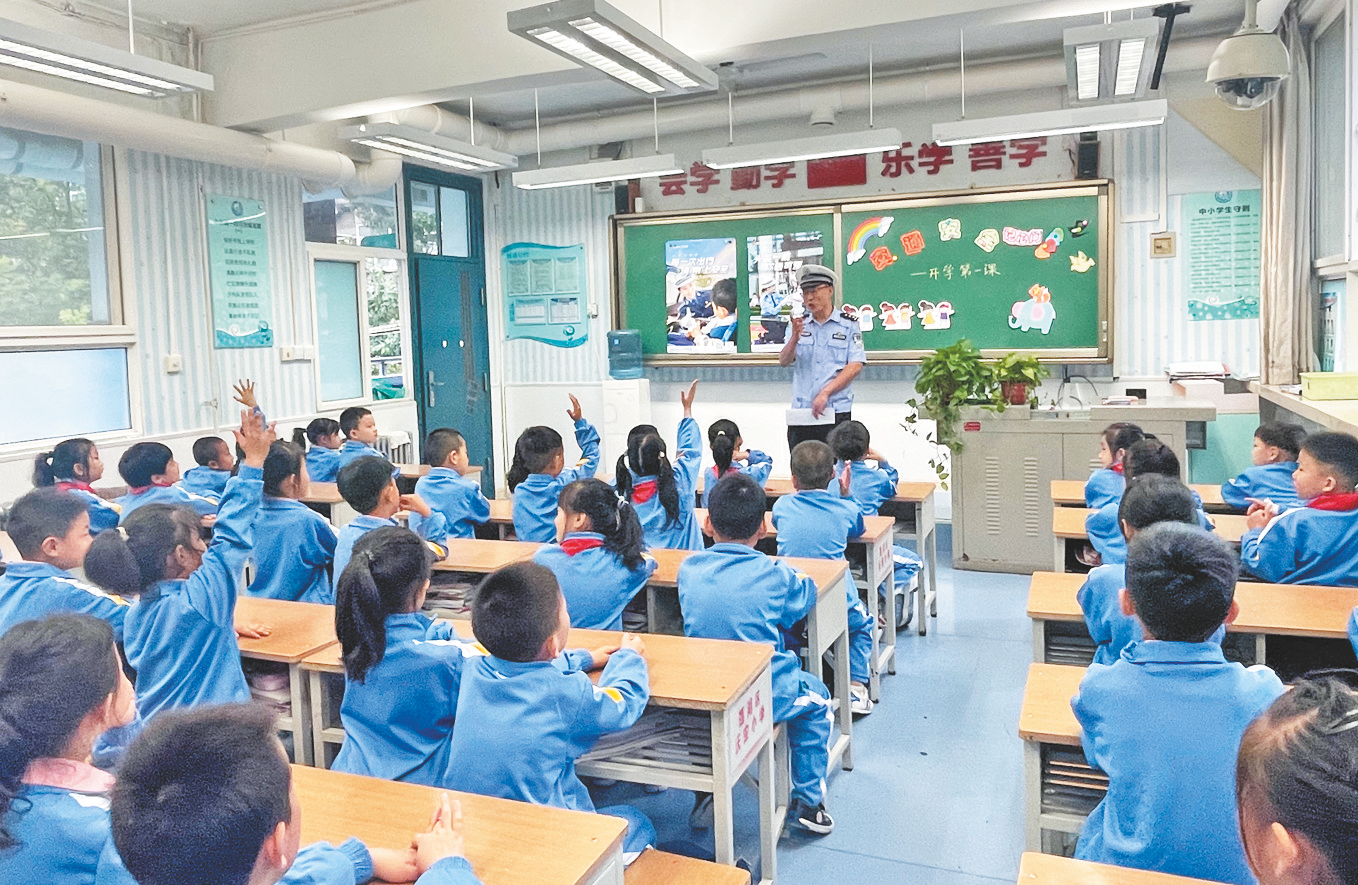 ▲ 9月1日,西安交警莲湖大队积极组织“一校一警”深入辖区中小学、幼儿园开展“开学第一课”交通安全主题教育宣讲活动。 本报记者 臧慧 殷博华