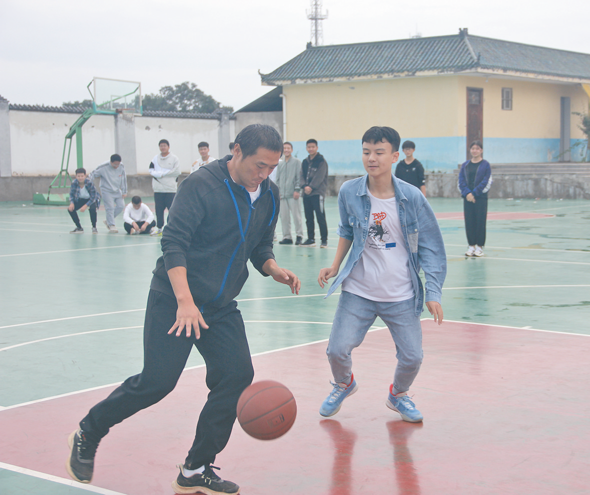 高一3班体育老师郗存辉在篮球场与学生打球。