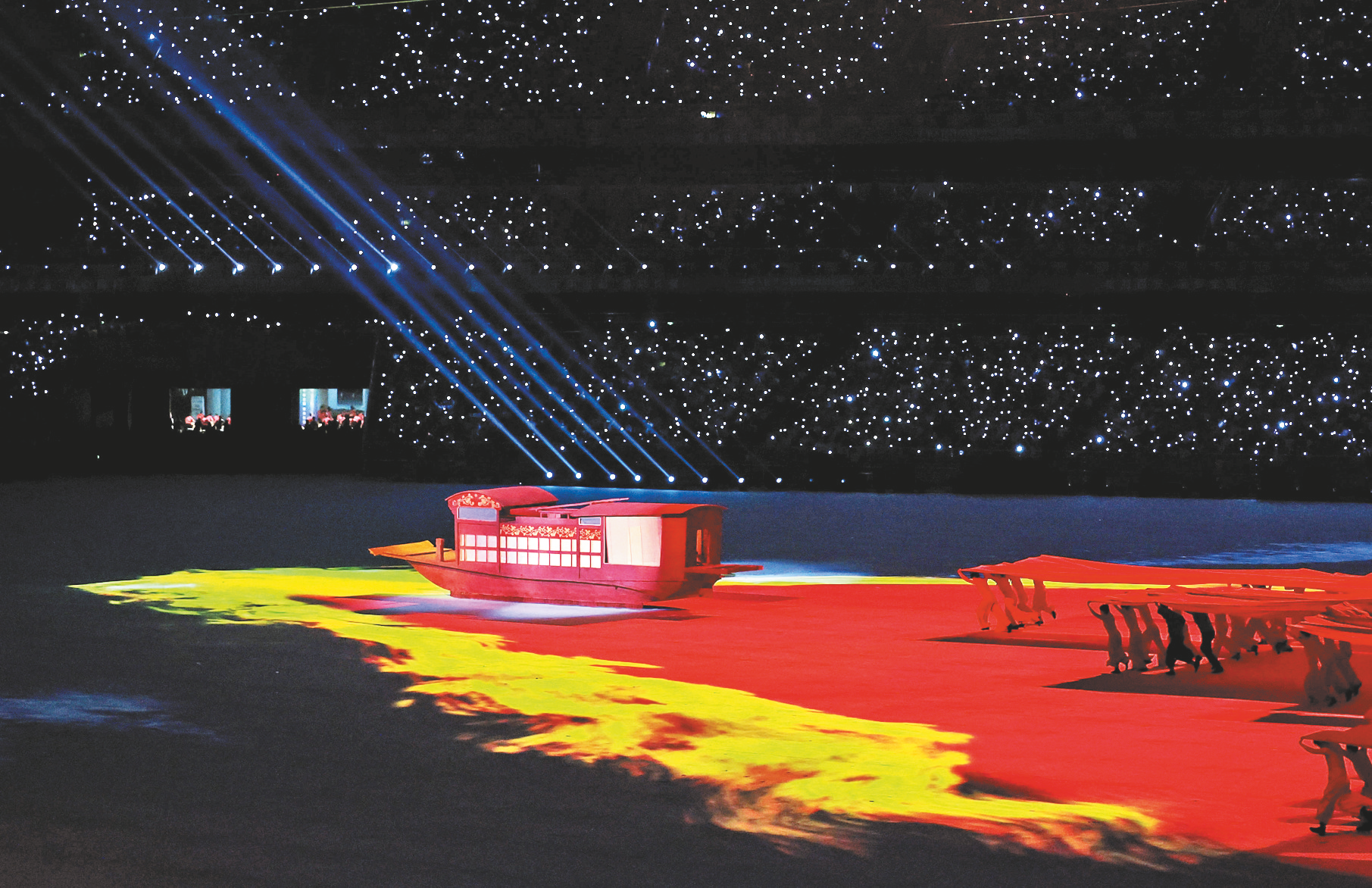 历史的车轮滚滚向前。舞台上,嘉兴红船缓缓驶过,中国共产党人激荡百年的奋斗历史,从这里起步。