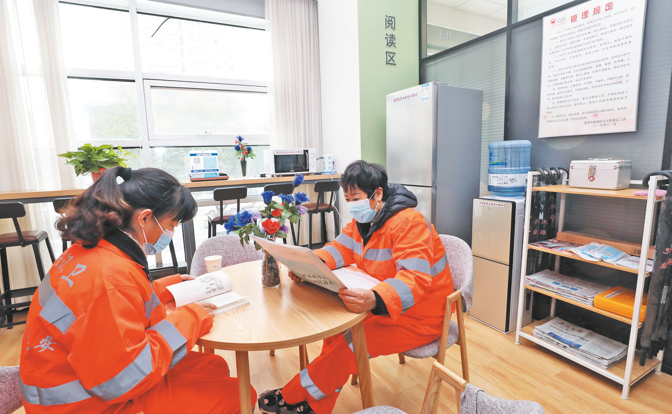 两名环卫工在北关街道党群服务中心工会爱心驿站休息看报。