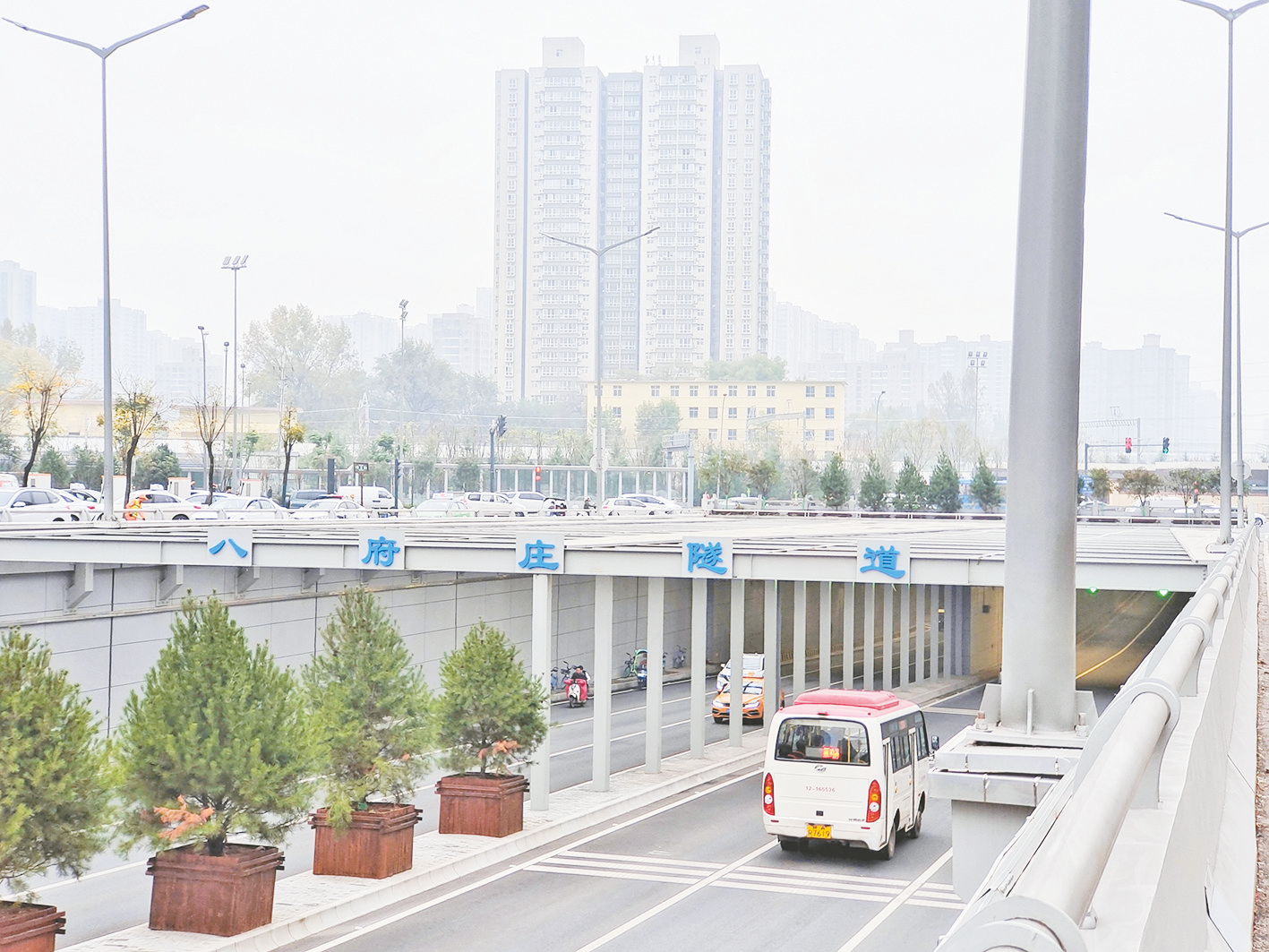 记者看到,隧道的脊背上承载着陇海铁路和华清西路两条交通主干线,双向六车道,隧道里灯光明亮,来往车辆各行其道,畅通无阻。