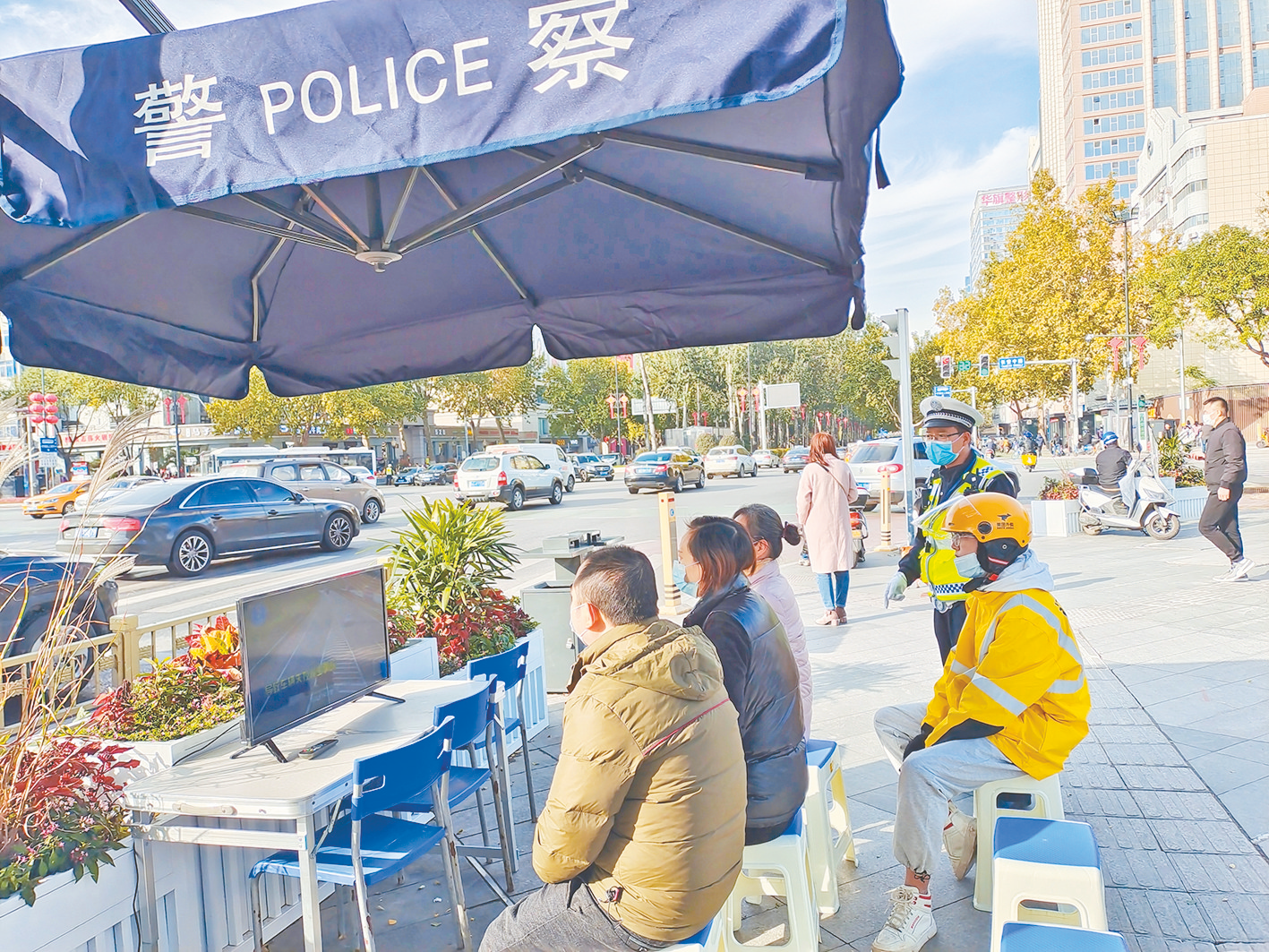 11月8日,西安市长安路与雁塔西路十字口东南角,交警在对行人和非机动车辆驾驶员交通违法行为纠错,要求违法人员在“马路学堂”观看交通安全警示教育片。