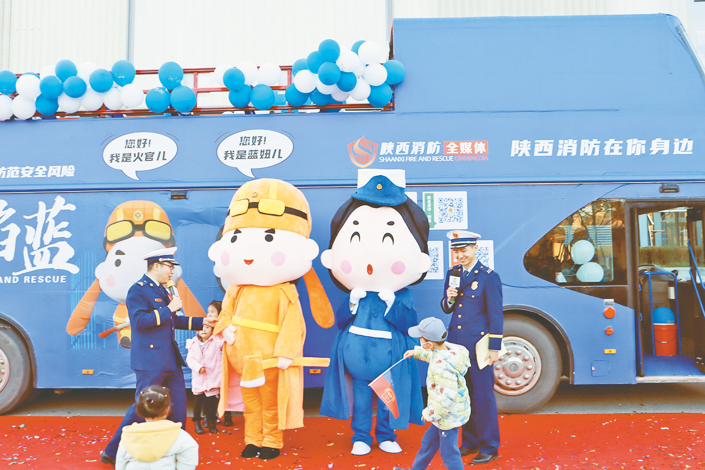 11 月 13、14 日,陕西消防救援总队开展“陕耀火焰蓝巴士”巡游活动,消防文创卡通IP形象“火官儿”“蓝妞儿”首次精彩亮相,与西安市民进行互动游戏。
