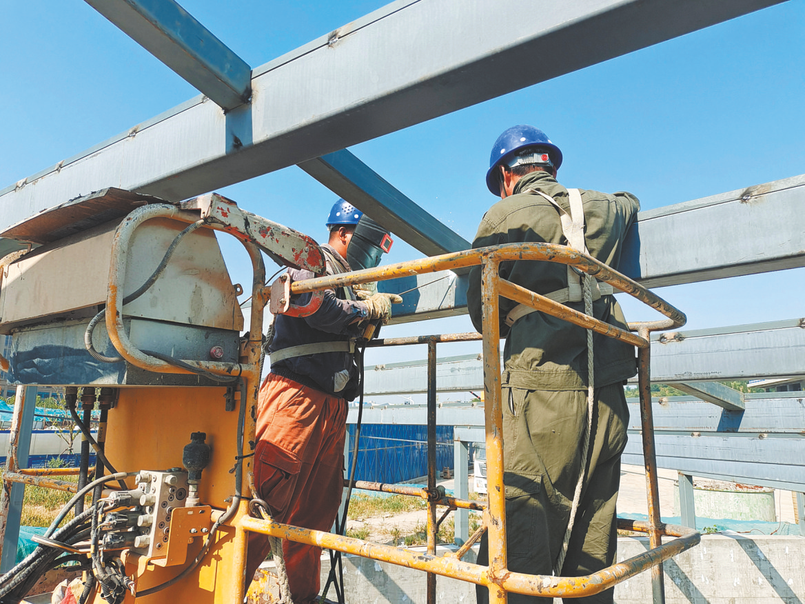 在白桦林溪项目工地,大型吊车停在墙外马路上,为了散发热量,操作手张磊敞开驾驶室门,右手不时伸向额头遮挡着阳光,左手按动操纵杆,眼睛盯着地面人员的指挥手势,把升降机的部件准确吊放到安装位置。张磊说:“干这行10年了,早已习惯风吹日晒。”
