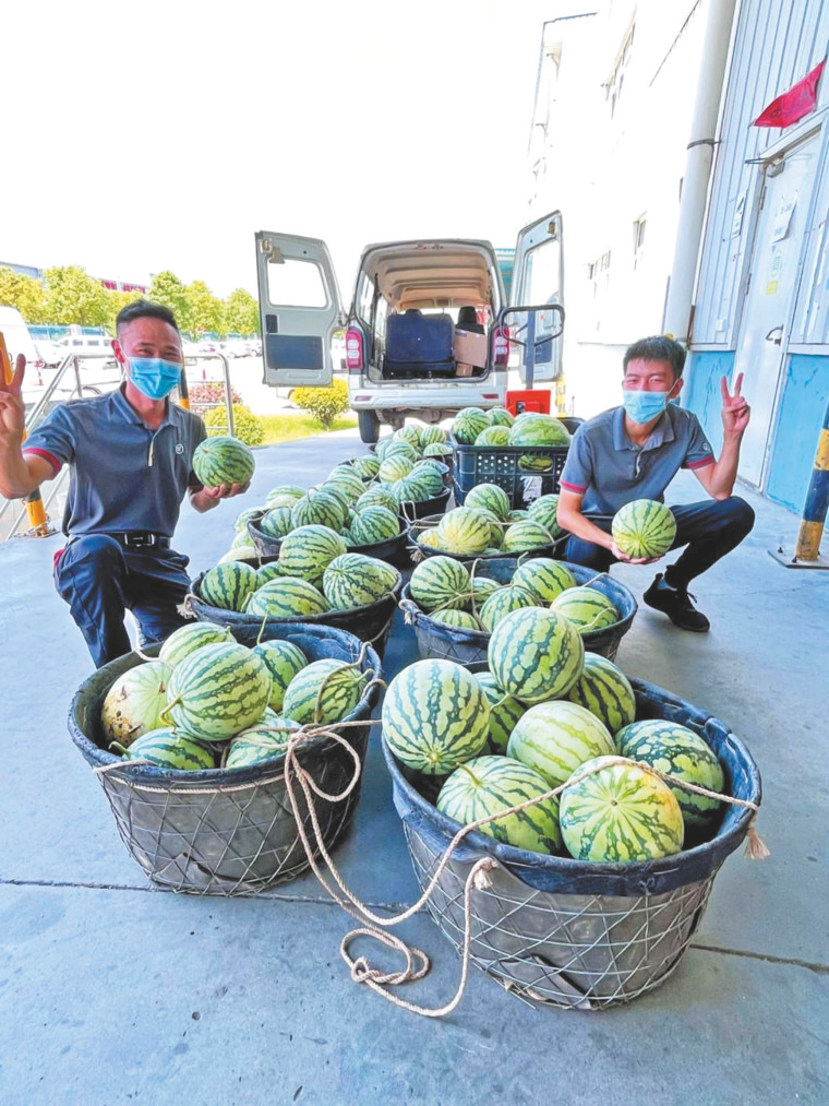 24日下午,顺丰快递员张小爽和同事们围坐在一起吃着西瓜。“吃几块西瓜,解馋又解渴!这真是公司伏天最硬核的关怀。”张小爽说。