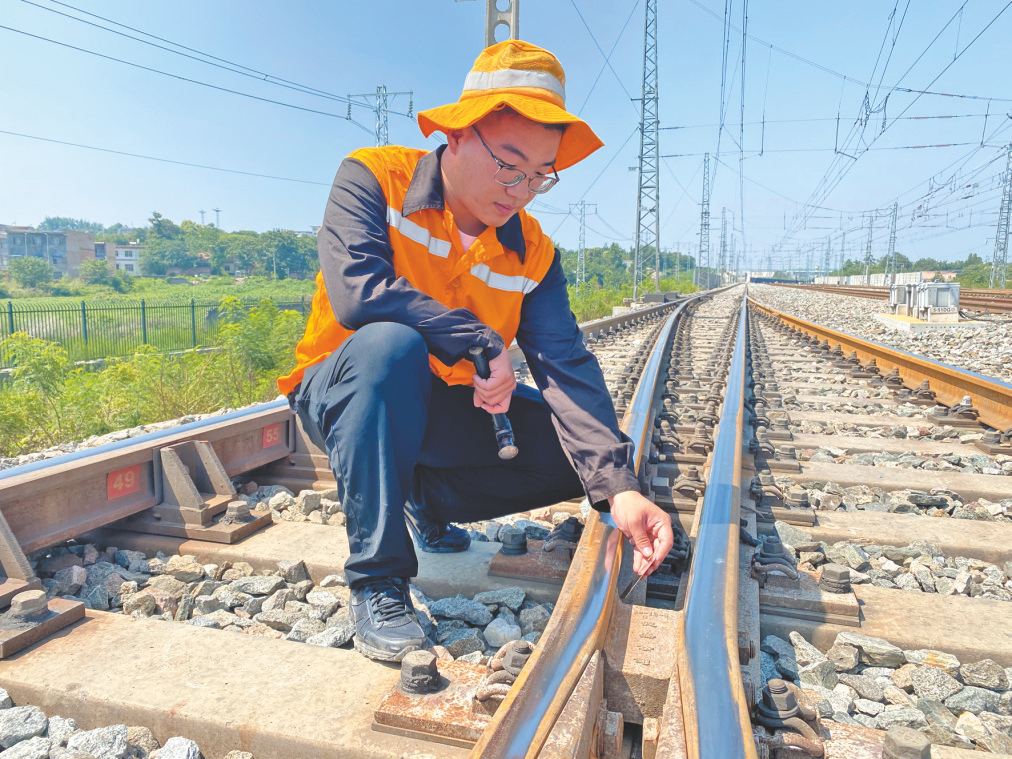 22岁的探伤工林李航如同往日一样,穿着长袖长裤,戴着大檐帽,在高温“烤验”下进行着新一天铁路“医生”的工作。