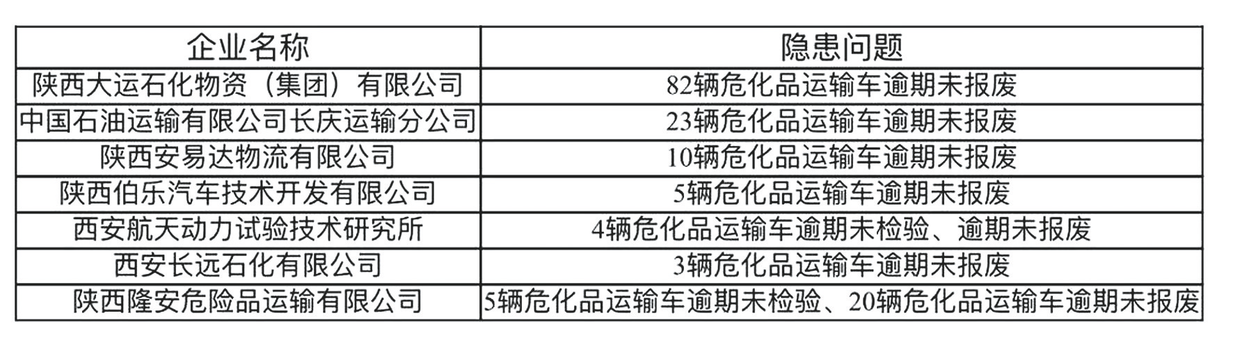 这7家企业中,陕西大运石化物资(集团)有限公司,有82辆危化品运输车逾期未报废;中国石油运输有限公司长庆运输分公司,有23辆危化品运输车逾期未报废;陕西安易达物流有限公司,有10辆危化品运输车逾期未报废;陕西伯乐汽车技术开发有限公司,有5辆危化品运输车逾期未报废;西安航天动力试验技术研究所,有4辆危化品运输车逾期未检验、逾期未报废;西安长远石化有限公司,有3辆危化品运输车逾期未报废;陕西隆安危险品运输有限公司,有5辆危化品运输车逾期未检验、20辆危化品运输车逾期未报废。