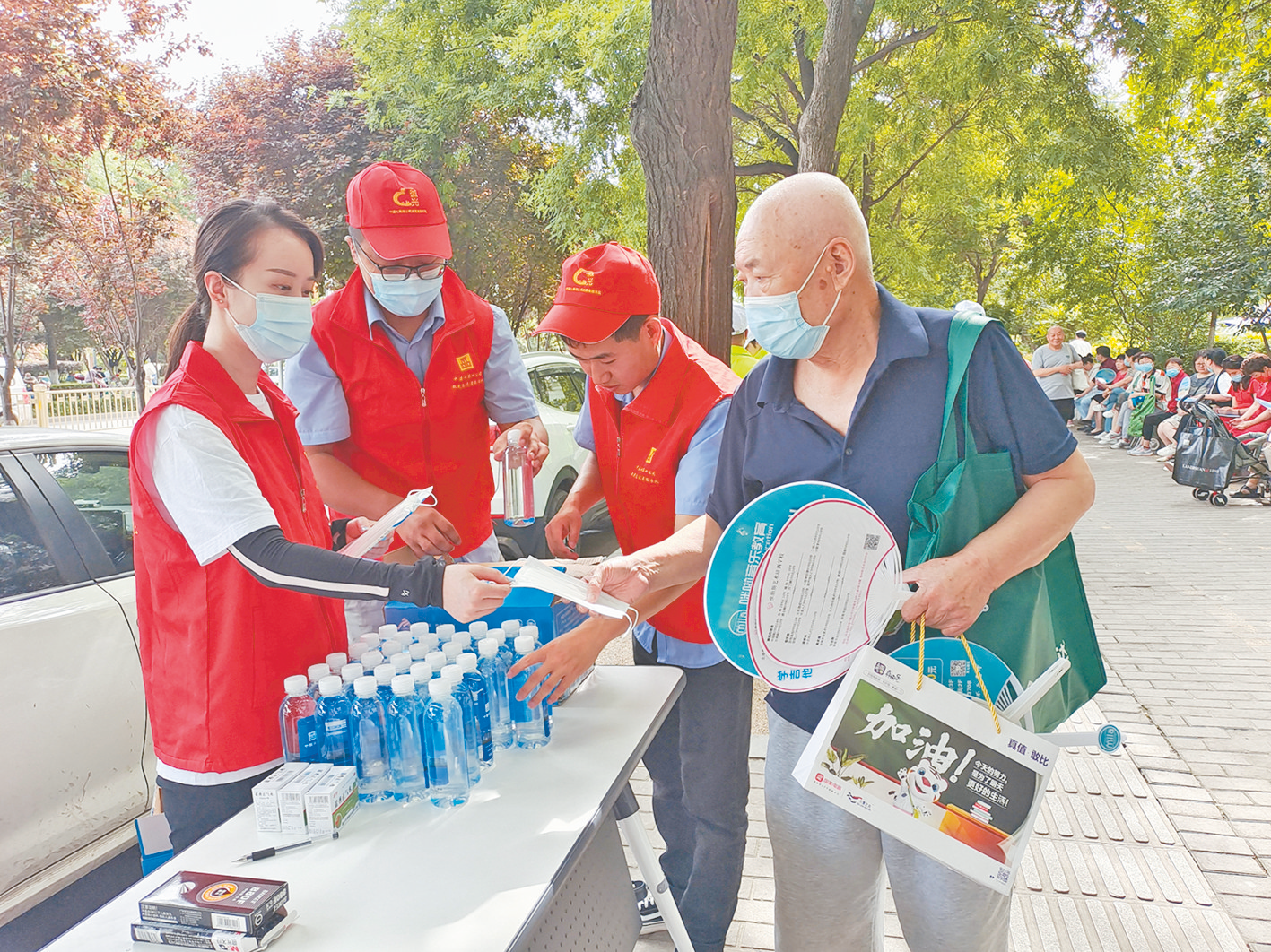 ▲ 中铁七局四公司志愿者给考生家长发放口罩