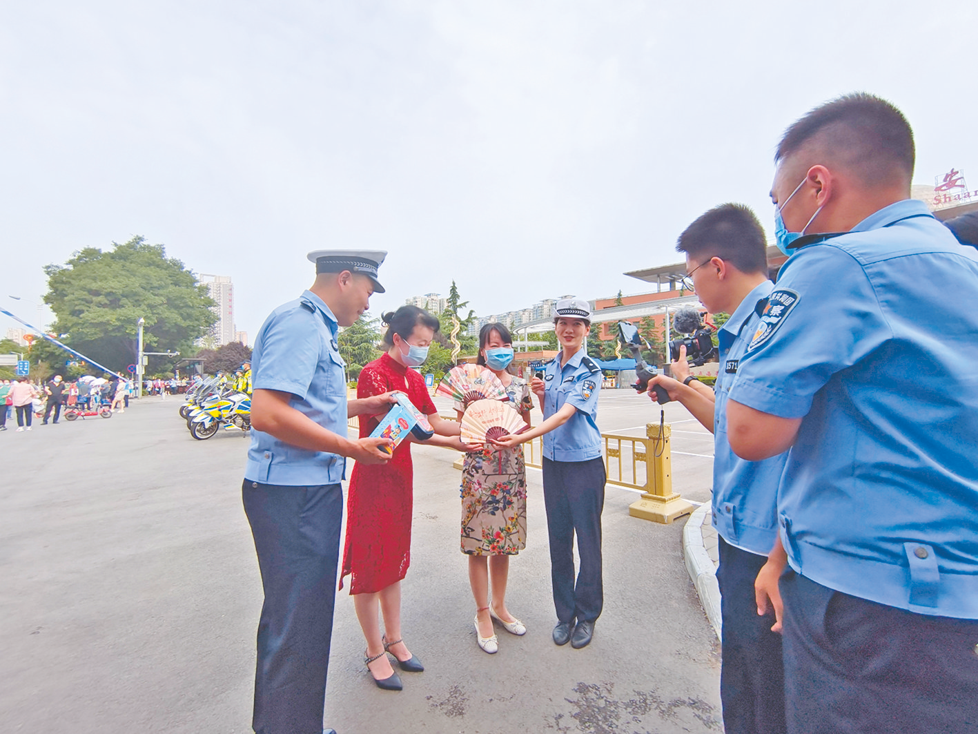 ▲ 民警给考生家长赠送写有“平安出行 金榜题名”的扇子