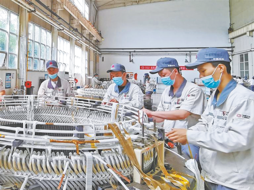 9月28日,在中车永济电机风力发电机定子生产车间,工人正围绕一台发电机定子进行线圈绝缘包扎作业。