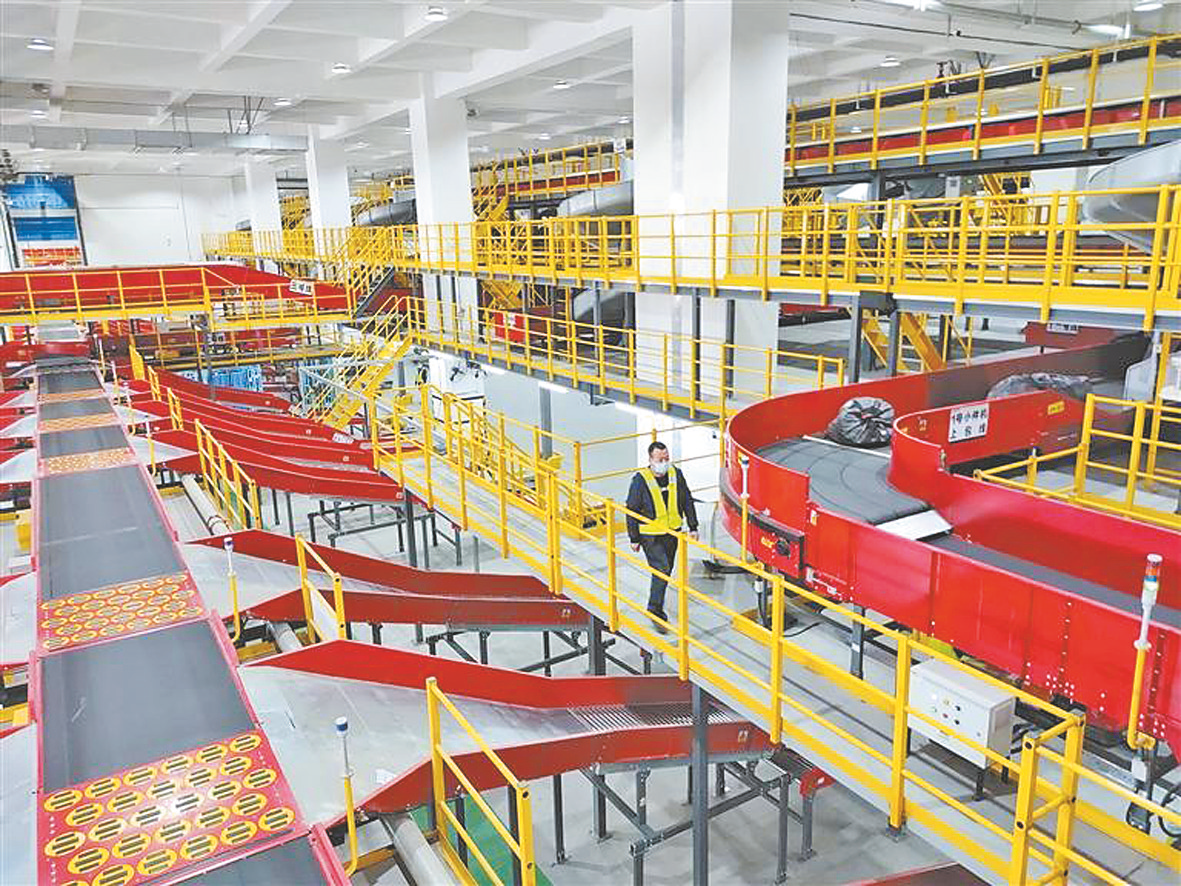10月15日,工作人员巡查顺丰汉唐中转场内的智能分拣线工作情况。 霍海澎 摄