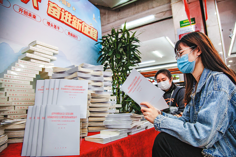 10 月31日,市民在西安新华书店图书大厦翻阅党的二十大报告单行本。