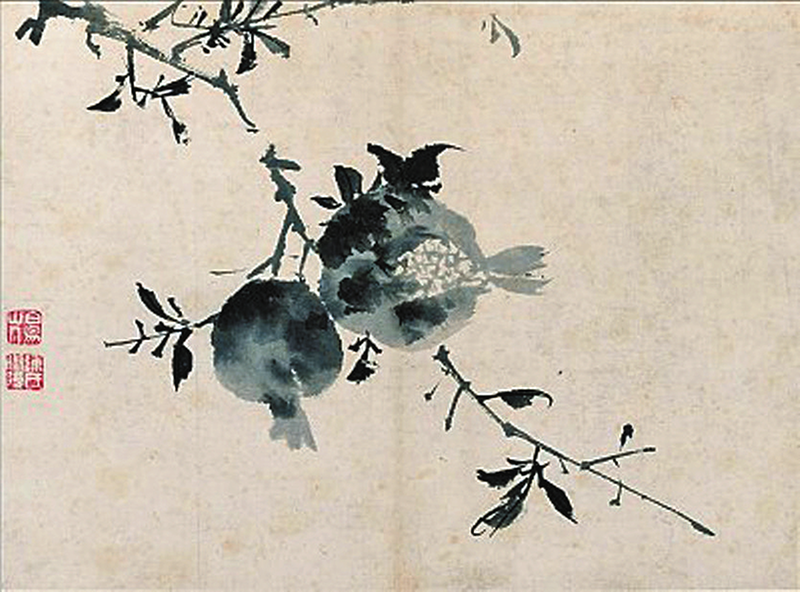 石榴深受历代画家的喜爱,近现代画家吴昌硕、张大千、齐白石、李苦禅、王雪涛、潘天寿等人都喜爱画石榴。其中,潘天寿突破传统画法,其花鸟画尤体现其雄强劲健的笔墨追求。潘天寿纪念馆藏有一幅《石榴图》,树干用笔显得生涩,有“屋漏痕”韵致,中锋与侧锋交替转换并用,提按、顿挫浑然一体;石榴及小枝则用圆笔中锋,如“折钗股”,圆健凝重。画家题句“为忆横磨十万箭,可怜仅得石榴来”,说明了张骞出使西域带回石榴种子的典故。一幅小小的花果,在画家笔下呈现出磅礴之势、万千气象。