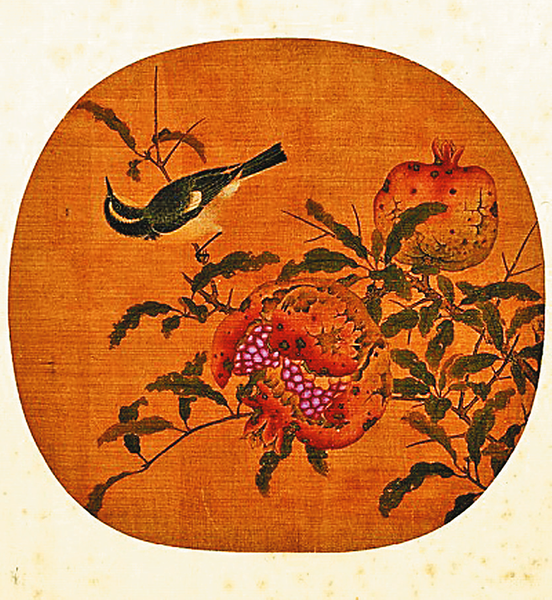 院体画工整富丽,石榴常常入景。故宫博物院藏南宋《榴枝黄鸟图》,描绘了深秋时节,石榴成熟,一只肥硕的黄鹂衔着小虫栖于榴枝上,悠然自得的景象。明代吕纪所绘的《榴葵绶鸡图》轴,石榴树上硕果累累,各色禽鸟聚于其间,树下群花灿烂,一只雄鸡昂首前视,雌鸡匍匐于花间。整体风格兼工带写,设色艳丽而不媚俗,既保持了华贵风范,亦兼具了纵逸的笔墨意趣。