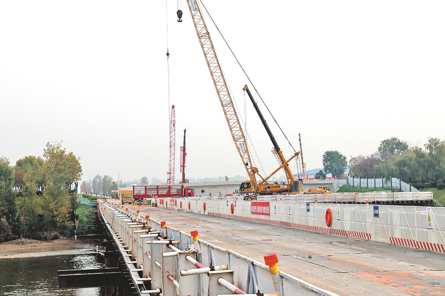 11月13日,在西安国际社区沣河梁家滩,全长526米,双向十车道的沣邑大桥正在施工中。沣邑大桥为三塔斜拉桥,宽57米,主塔高95米,设计时速60km/h,由中铁三局集团有限公司施工建造。作为连通西安国际社区两岸的重要通道,沣邑大桥通过分隔人和车辆的设计,实现景观性、功能性、经济性的有效融合,使沣邑大桥颜值和功能兼具,带动灵沼片区发展,预计2023年底竣工。